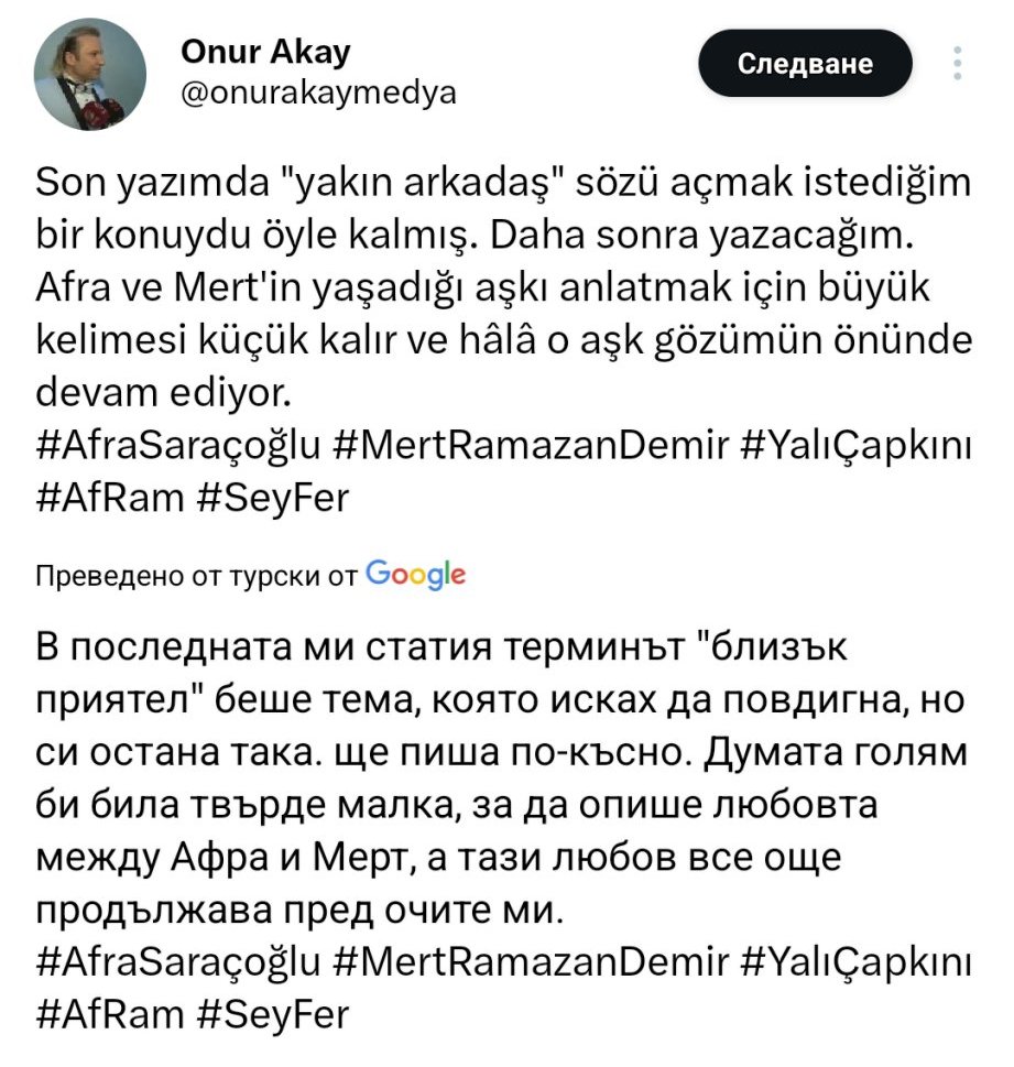 Онур А чете много акаунти в Х . Само преди дни  се изпокараха с инфото , че Афрам решили да си останат приятели ( което за мен означава , че са решили да не са заедно Grinning) и сега е решил да блесне с тази  "новина "