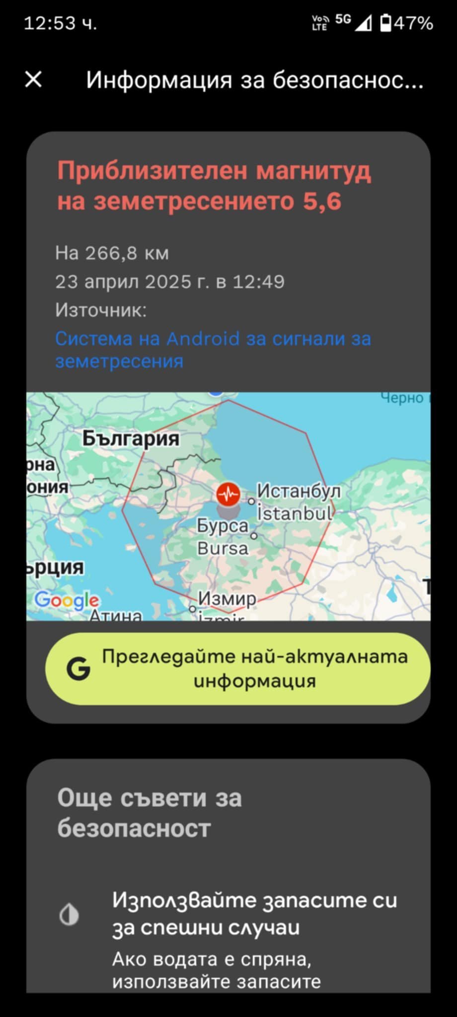 Чак указания какво да правя,защото ще има вторични трусове и ми пише на 266 км от вас.