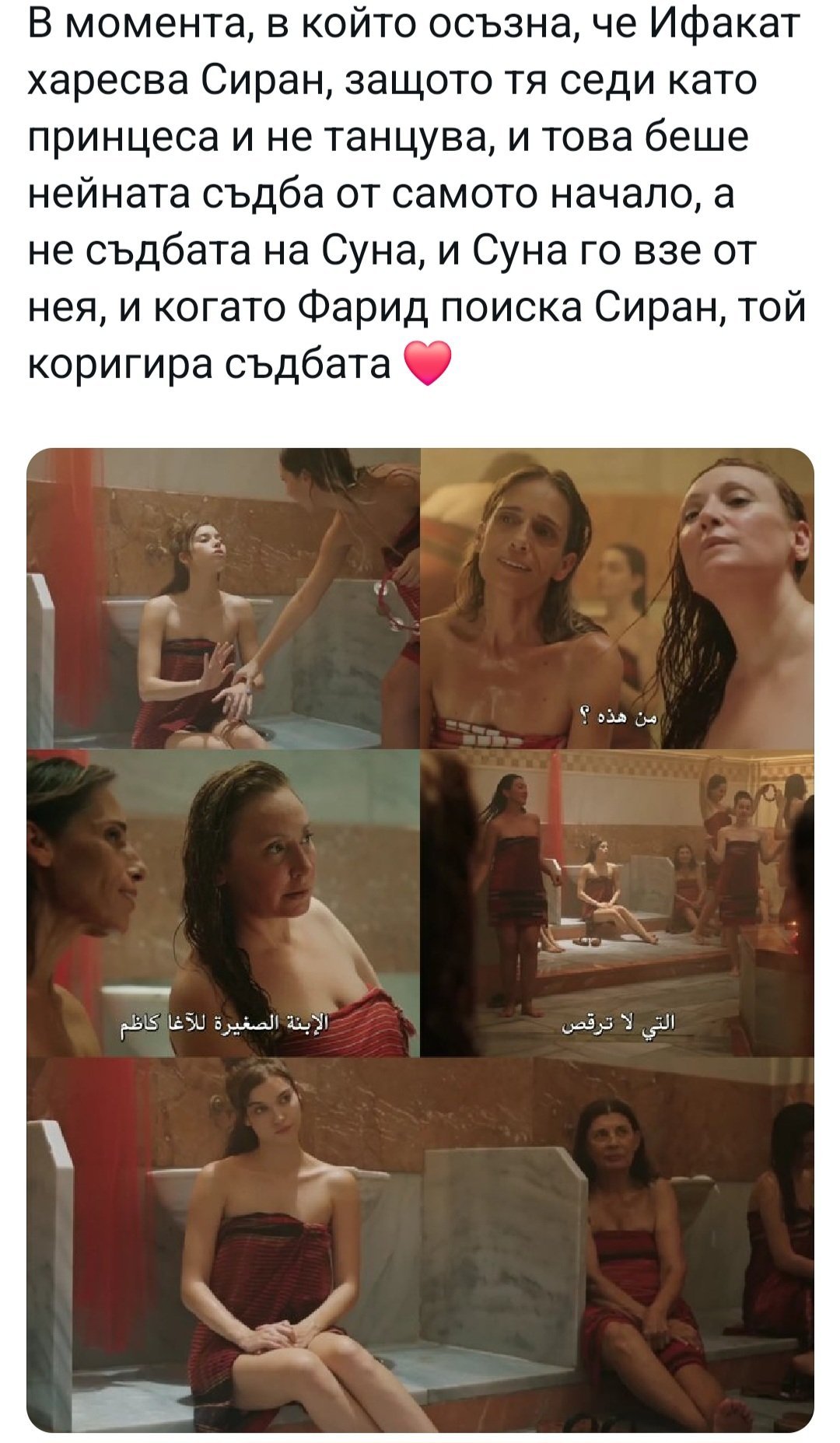 Привет, момичета, много несправедливости има в тоя сериал. Но най ме е яд, че Ифакат и тя изопачи истината, за да е в нейна полза. Каза на Суна, че тя била първия избор, а не бе така. Сейран бе първия избор на Ифакат в банята. Но сводницата и каза, че е по-добре Суна, и като характер, и като по-голяма. Ферит просто поправи съдбата, възстанови избора на Ифакат. Ферит направи правилния избор, със Суна щеше да е нещастен. Тя ни се води, ни се кара. Иска имоти, пари и власт, като баща си. Сейран само е избухлива като баща си, но само в началото, защото не се примеряваше с несправедливостта.