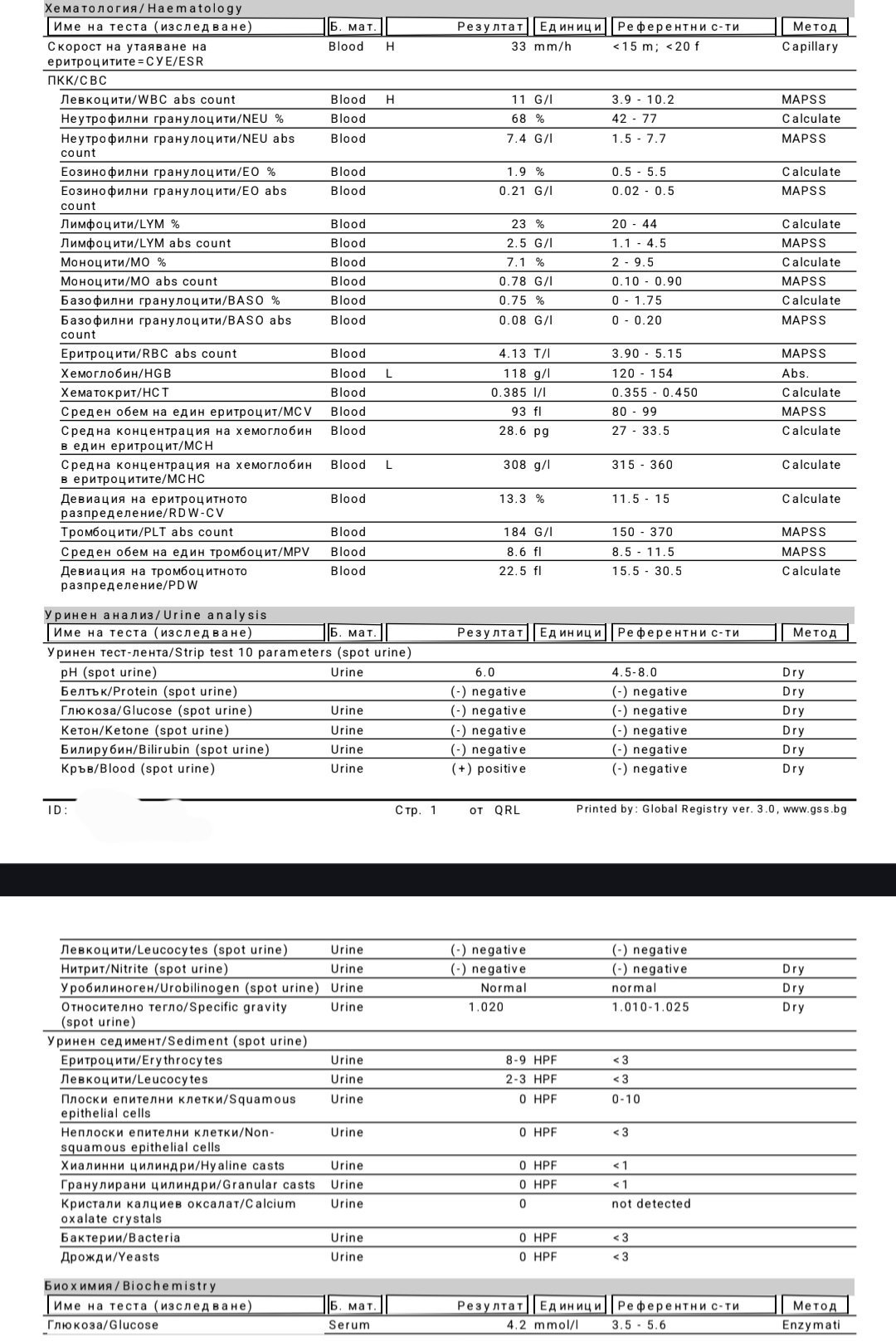 Здравейте, момичета! Вече съм на 33та г.с. Споделявам с вас резултатите ми от кръв и урина. Оказа, че съм имала кръв в урината, а в предишните ми изследвания бяха с отлични резултати. Исках да видя и вашето мнение относно сегашните ми резултати