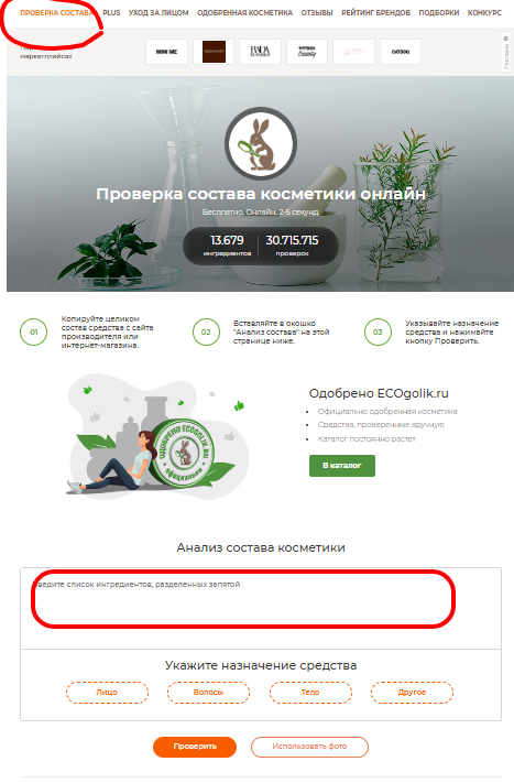 Когато се влезе в сайта се натиска "Проверка состава" - в горния ляв край на страницата. Отваря се страница, в която има прозорец, който съм маркирала в червено и там се копират съставките ( копирам от iHerb състава, който е даден в Other ingredients/Други съставки и го пренасям в маркирания прозорец в сайта за проверка). След това отмятам за коя част от тялото става въпрос, т. е Лице в твоя случай и се натиска оранжевия бутон "Проверить". Излизат всички съставки в съответен цвят и звездички - има описано значението им. За всяка съставка има обяснение, ако се маркира с мишката.