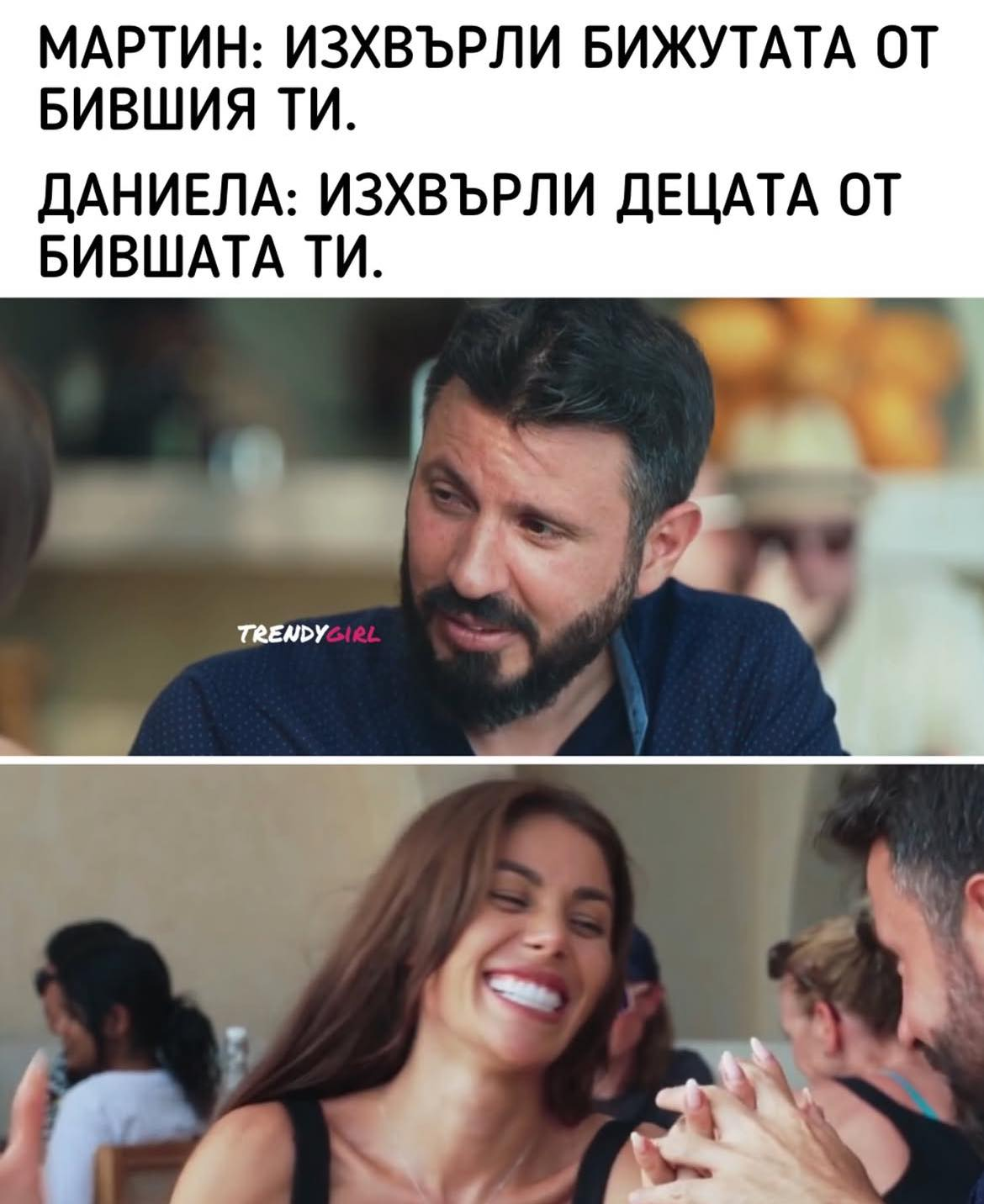 Мартин е типичният разглезен финансово и емоционално плейбой, който в момента си прави т...к с всички - зрители и момичета вътре. Той е там, за да си разбообрази живота и да си прави кефа. Има пари, угажда си, както се казва. Според мен е овладял до съвършенство любовния поглед с малко престорено притеснение в стил ''ша ма убидиш'', с който иска да каже ''ох, аз съм малко уязвим, имам чувства'', но всъщност, според мен, от мъж като него е добре да се бяга далеч. Мисля, че е извънредно здраво стъпил на земята човек. Все пак, не си оттеглям мнението, че за мен той е най-интересният участник. Даниела пък е извънредно ясна - тя прозира през фрази като ''тъпа на манивела'', това вчера за децата, което каза, убедена съм, че и други издайнически фразички изскачат, които не чуваме. Все ни се ще да има някаква по-грандиозна идея зад това, което гледаме, напр. НН да иска да покаже колко е пошло съвременното общество, материално и пр., но едва ли. Тези дрешки от пазара вчера е ясно, че бяха само за майтап, сигурно тази сюжетна линия я е имало в друг Ерген по света и искат да я повторят. Даниела не я виждам с тези парцали.