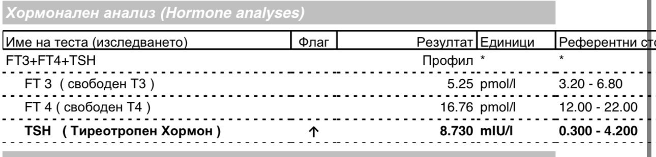 Иначе предните пъти като го мерих не беше толкова високо и тя ми каза, че принципно трябва да пия хормон, ама не е спешно. Каза ми ако искам да си взема Тирохелп, хранителна добавка.