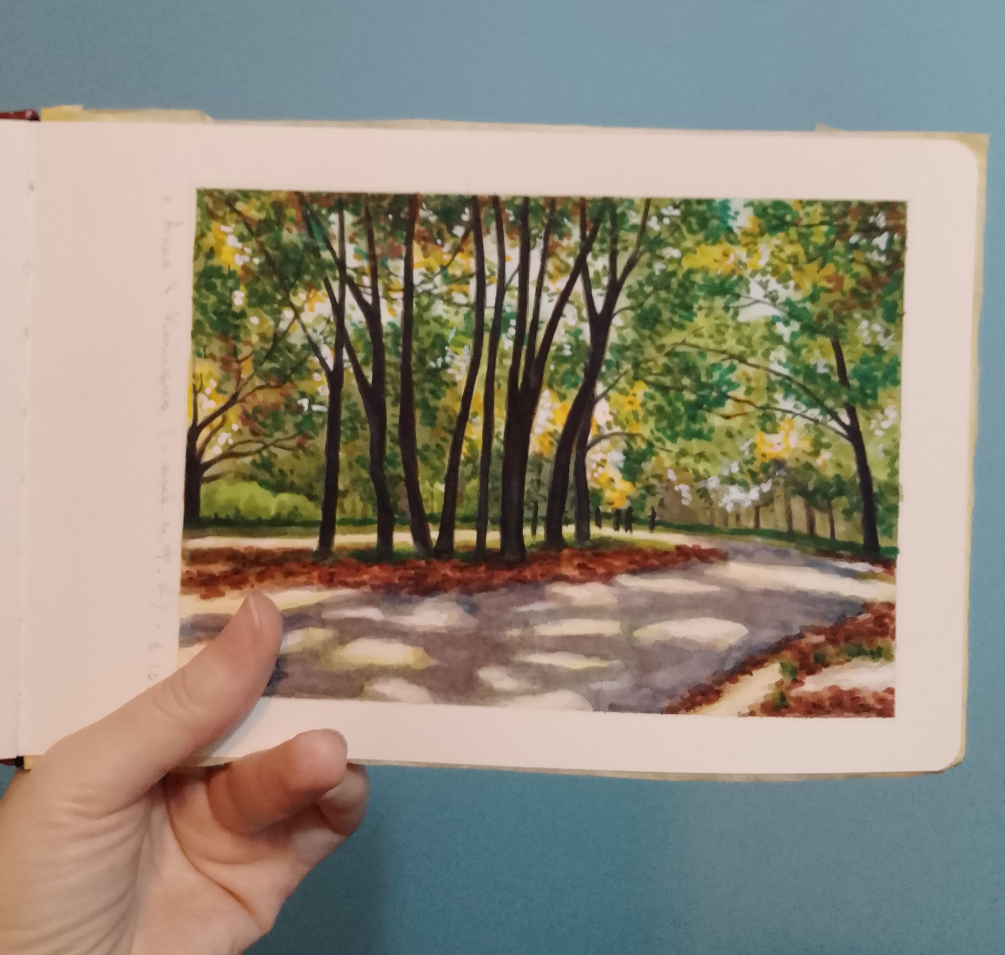 Аз пак се опитвах да рисувам с акварелни маркери, този път в скечбука. Много са странни - констатирам го за пореден път. На някои хартии всичко става като едно голямо петно, след като ги активирам с вода, а на други (като в този скечбук) почти не се разтварят.
