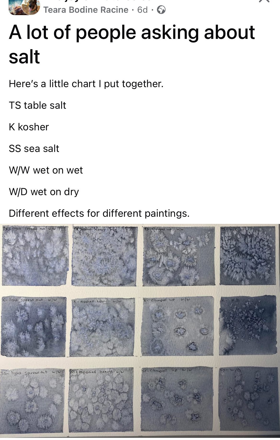 Прочетох за него преди много години в една книга за рисуване и тогава беше успешно. Май изпозвах морска сол. Не помня. Но сега по клипове ми се струва, че ползват обикновена сол.