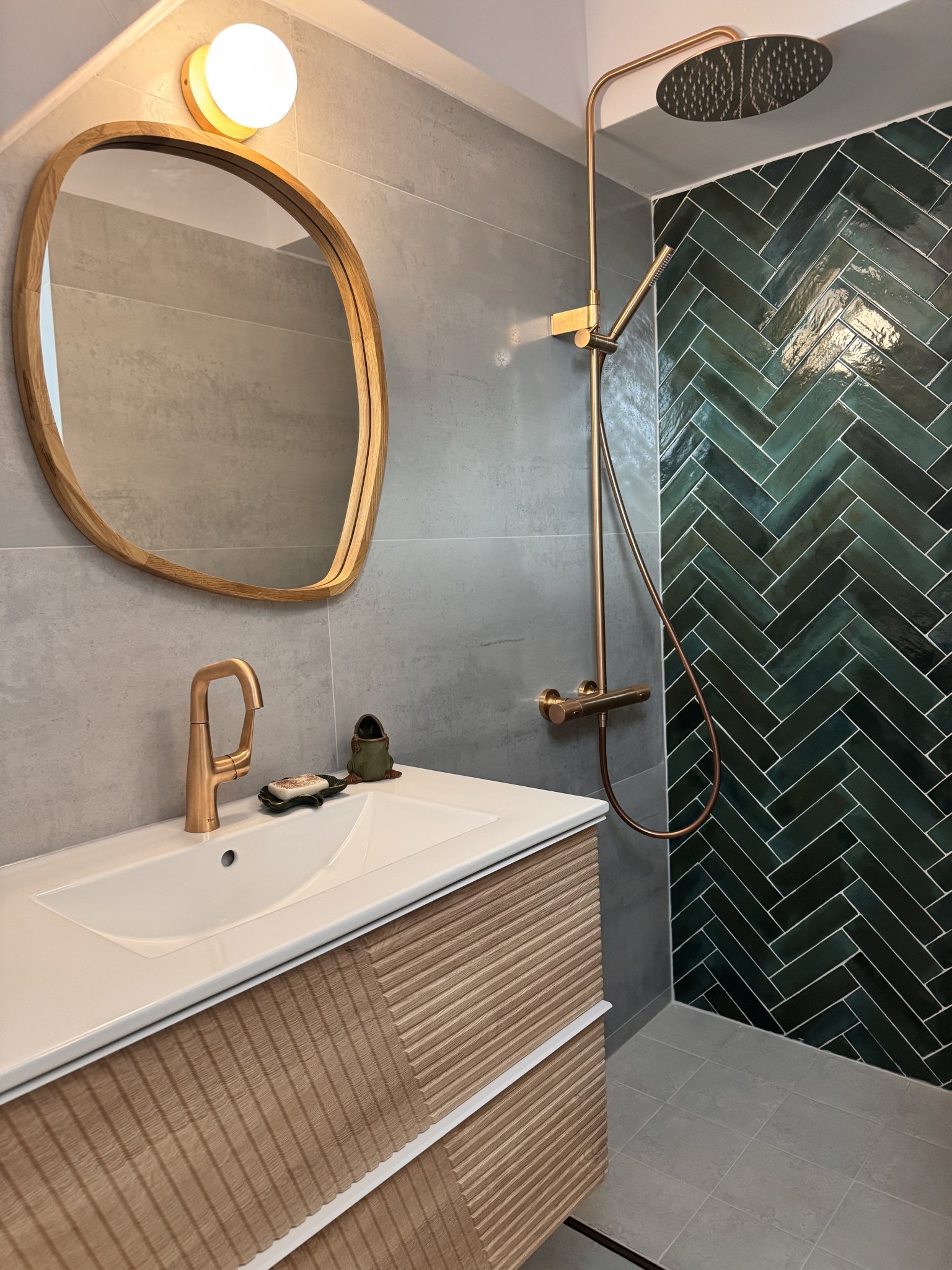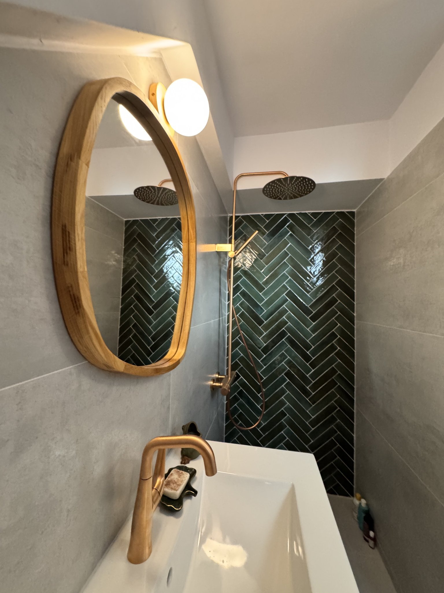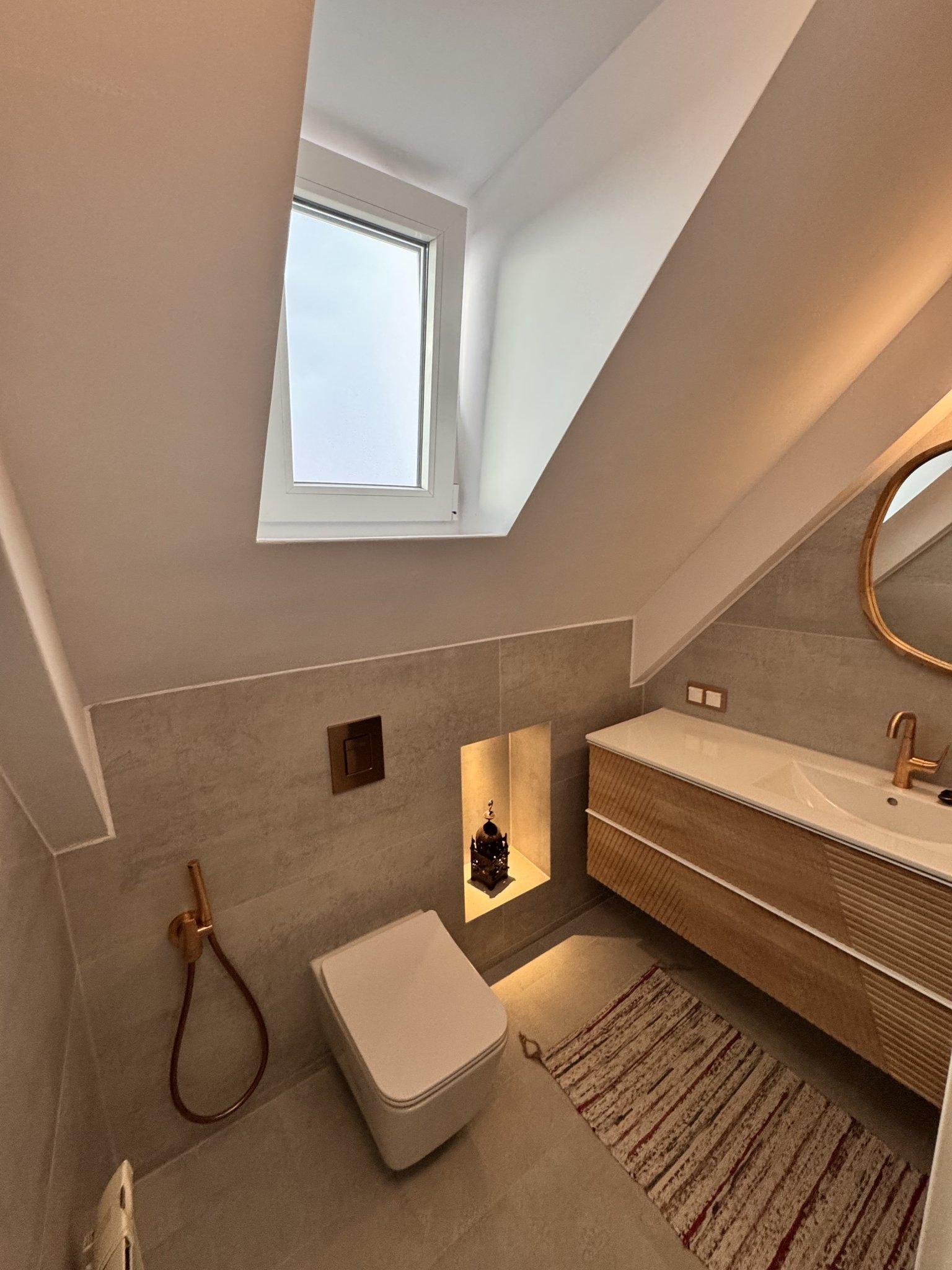 Е, има си кусури, но то кое няма. 🙂 Остава да се сложи параван тип хармоника (поръчам е и го чакам), разни декорации и т.н. Килимчето е старо и няма да е това, декорацията в нишата ще е друга и т.н, но това е общата визия. Благодаря на всички, които отделиха от времето си да ме посъветват!