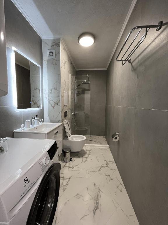 Ето снимки на голямата ваканционна баня, с голяма душ-зона, но въпреки това пръскаше навън и се мокреше и от мен, докато стигна до хавлиите (и докато се избърша). А вентилаторът не беше достатъчно мощен, очевидно, защото не се изсушаваше (вече забърсано с моп) достатъчно бързо.