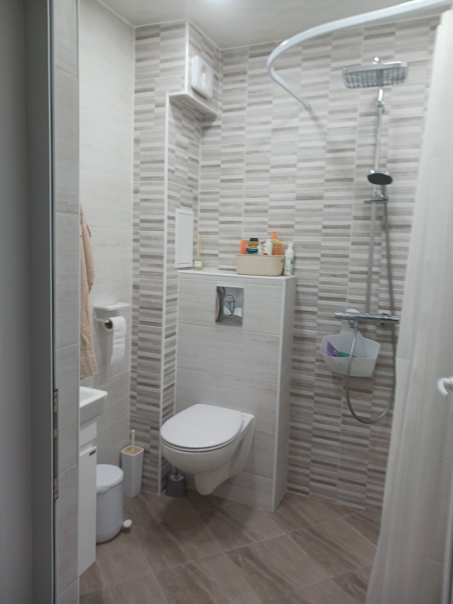 Ми на мен не ми се мокрят нито в малката, нито в голямата, в голямата мислехме за параван, в малката ако има нужда от завеса, ами няма... Освен това в къщата има 2бани и една отделна тоалетна, който не му харесва мокрия под може да върви другаде😄