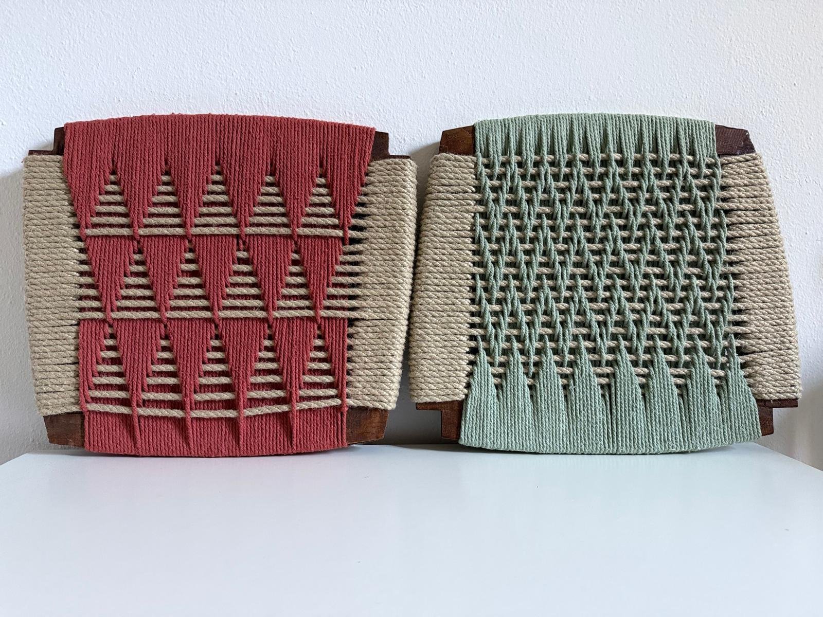 2. Същинската плетка в другата посока. Тук можете да си измисляте фигури или да пресъздадете някоя от класическите плетки за седалки. Плете се като на стан - минавайки ту отгоре, ту отдолу. Трябва да се намери баланс между опъването на въжетата, важно е да са хубаво опънати, но не и пренатегнати. За опъването си помагам с щипка. Става по-трудно в края, когато започва да няма място за промушване, а въжетата са все по-натегнати, там се иска малко по-груба сила и пада по-здраво дърпане. Simple Smile За фигурите трябва да се внимава и брои, понеже лесно се греши и поправката става само с разплитане и връщане назад или решаваш, че не е фатално и продължаваш напред.