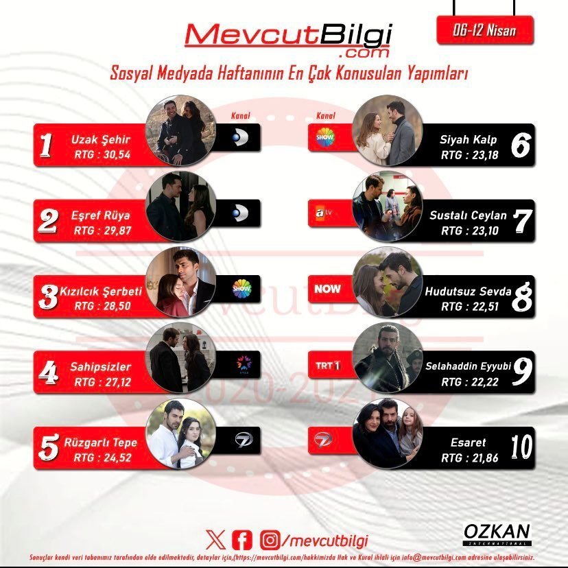 Eşref Rüya се класира на второ място сред най-обсъжданите телевизионни сериали между 6 април и 12 април, а Çağatay Ulusoy и EşSan се класираха на първо място сред телевизионни двойки и актьори