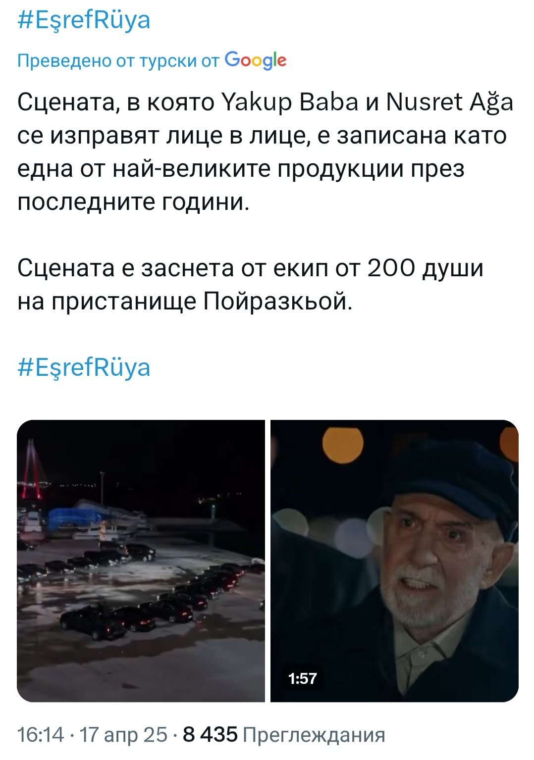 Сериалът “Сънят на Ешреф” се присъединява към списъка на сериалите, постигнали рейтинг на гледаемост от +7 и повече, написани от него, след сериалите “Заветът”, “Пойраз Карайел”, “Марашли” и “Организацията” 👏🏻🖤!