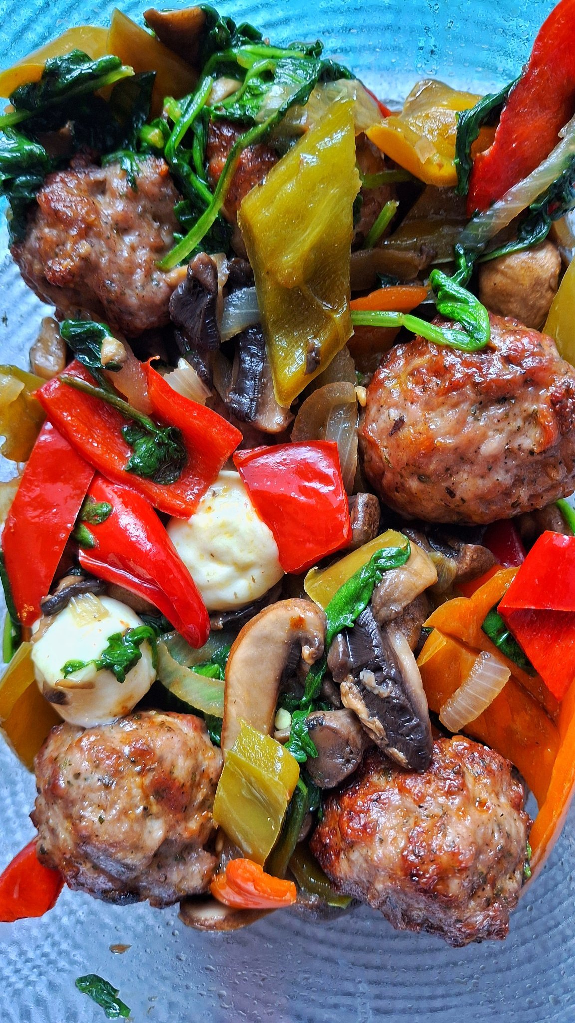 Мини кюфтенца пекли и със зеленчук ги гарнирали и бейби моцарелки. Вкусно беше. Рецепта няма, но то е ясно какво е.