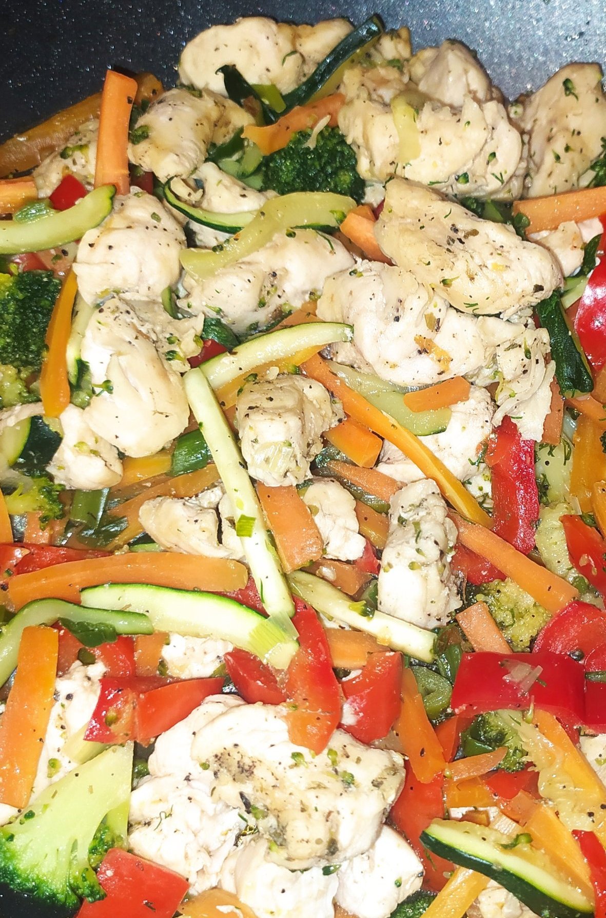 Пилешко със зеленчуци и тиквички на грил тиган