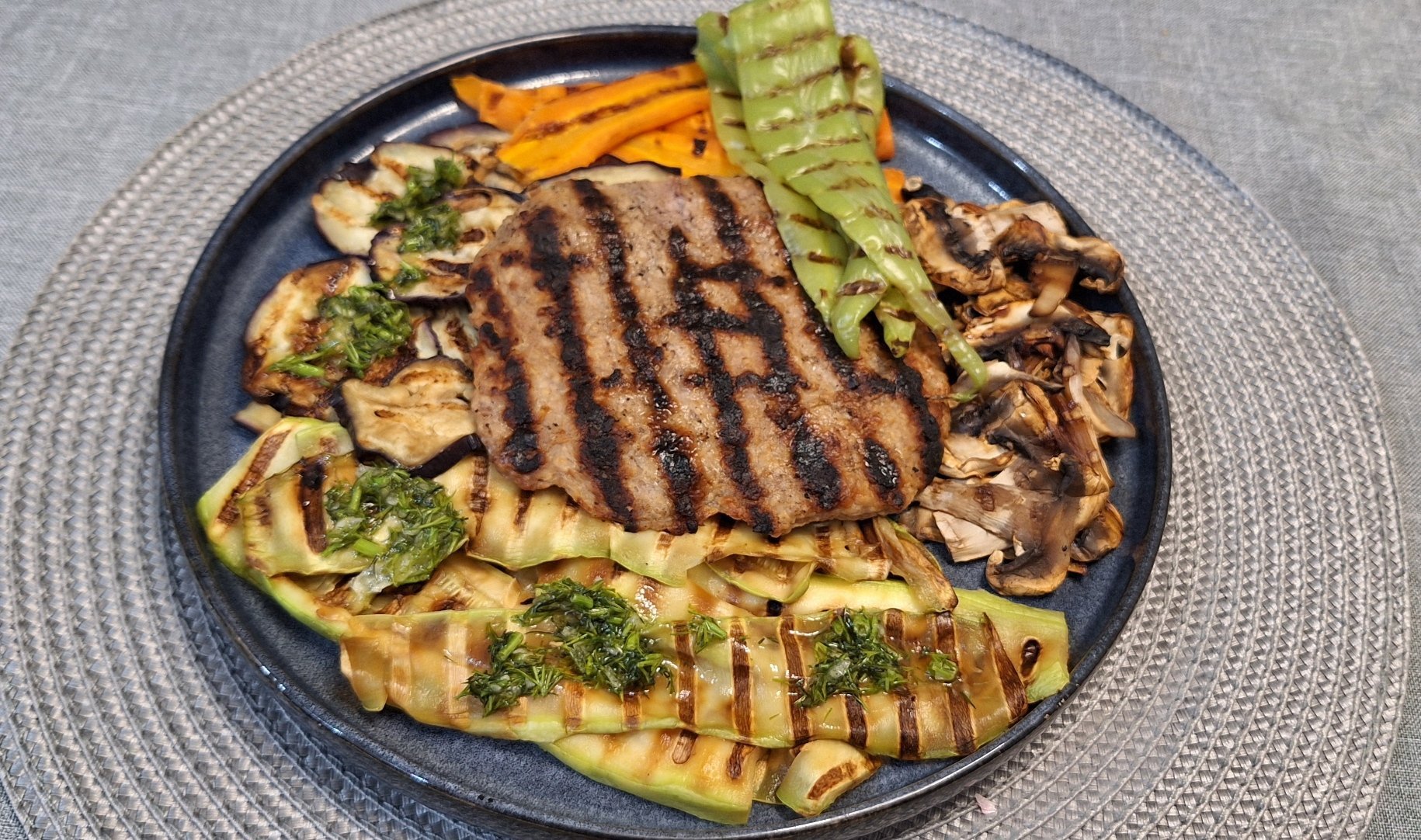 Нещо като мешана зеленчукова скара с гарнитура плескавица Blush
