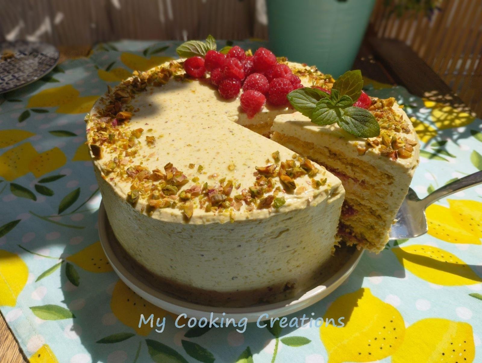 Медена торта (медовик) с шамфъстък и малини