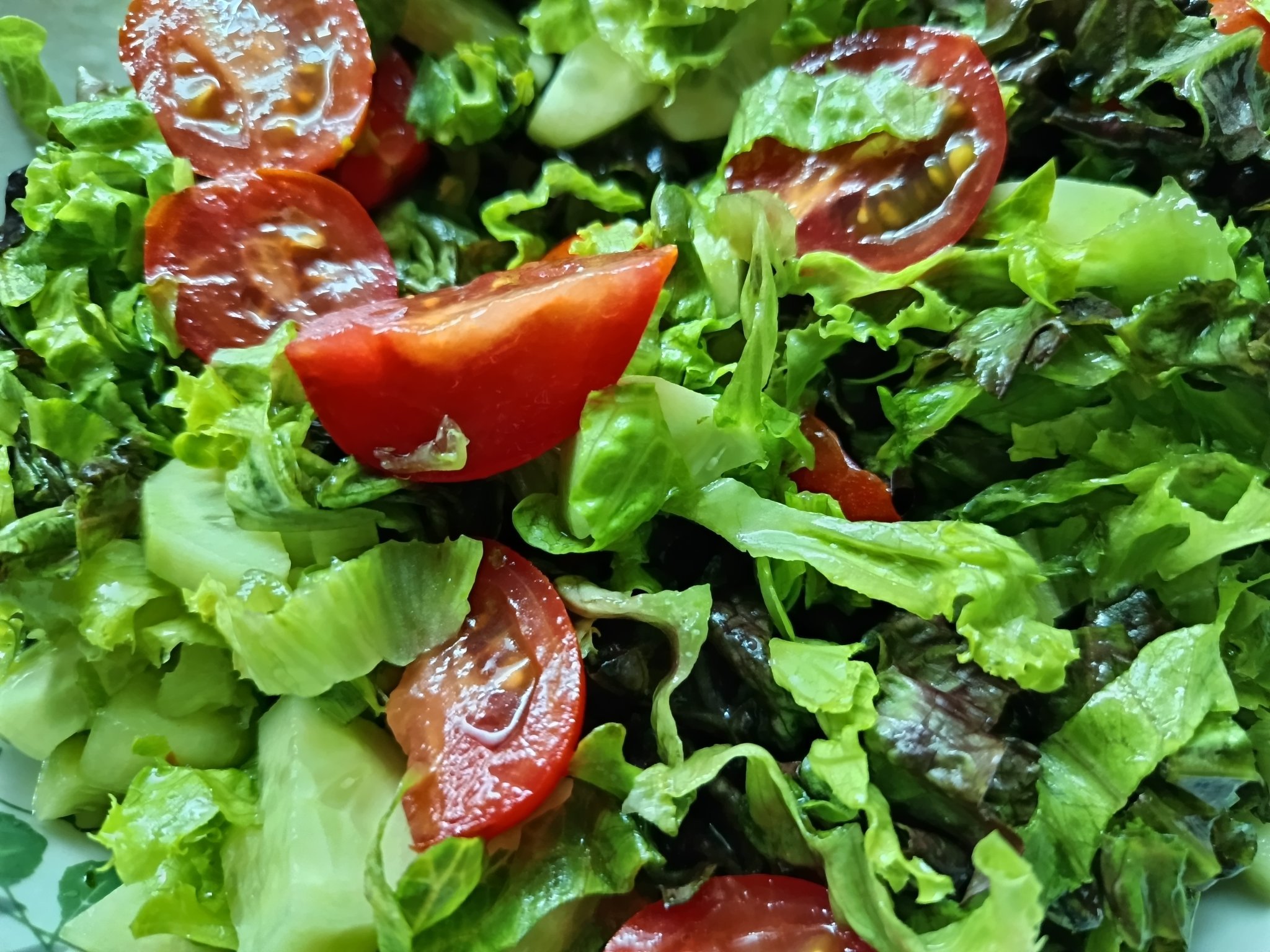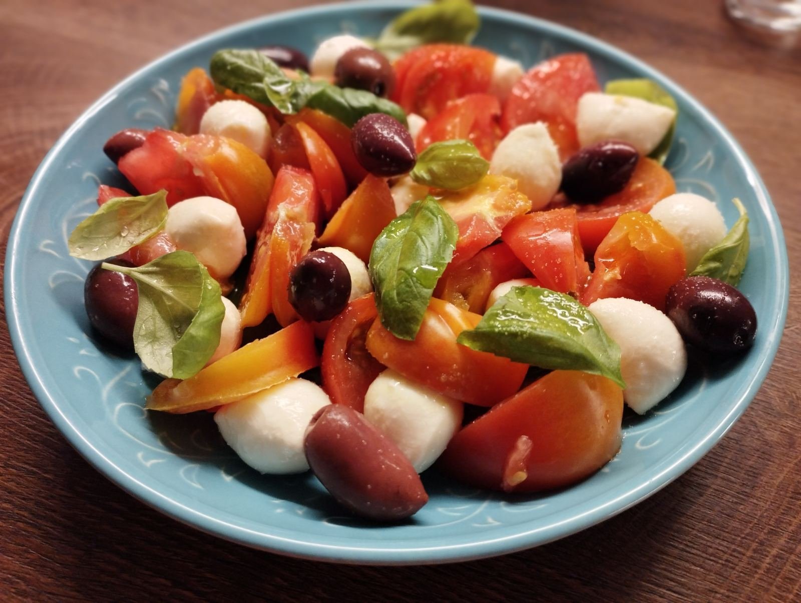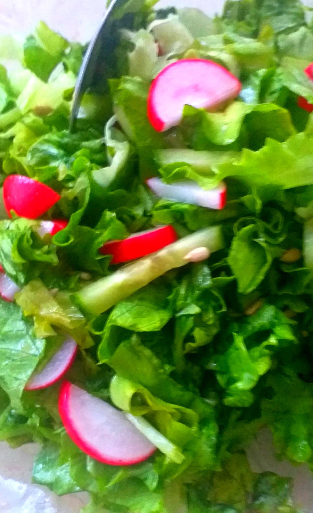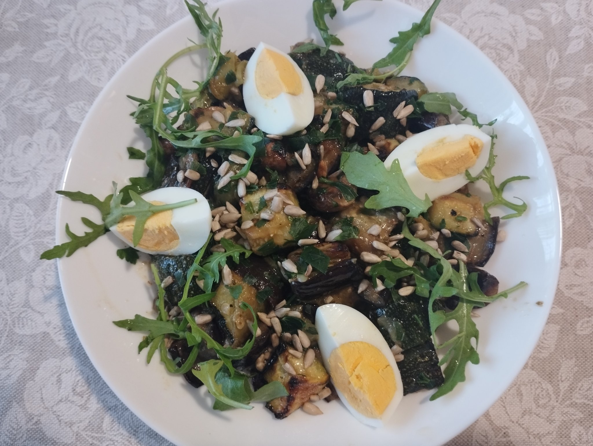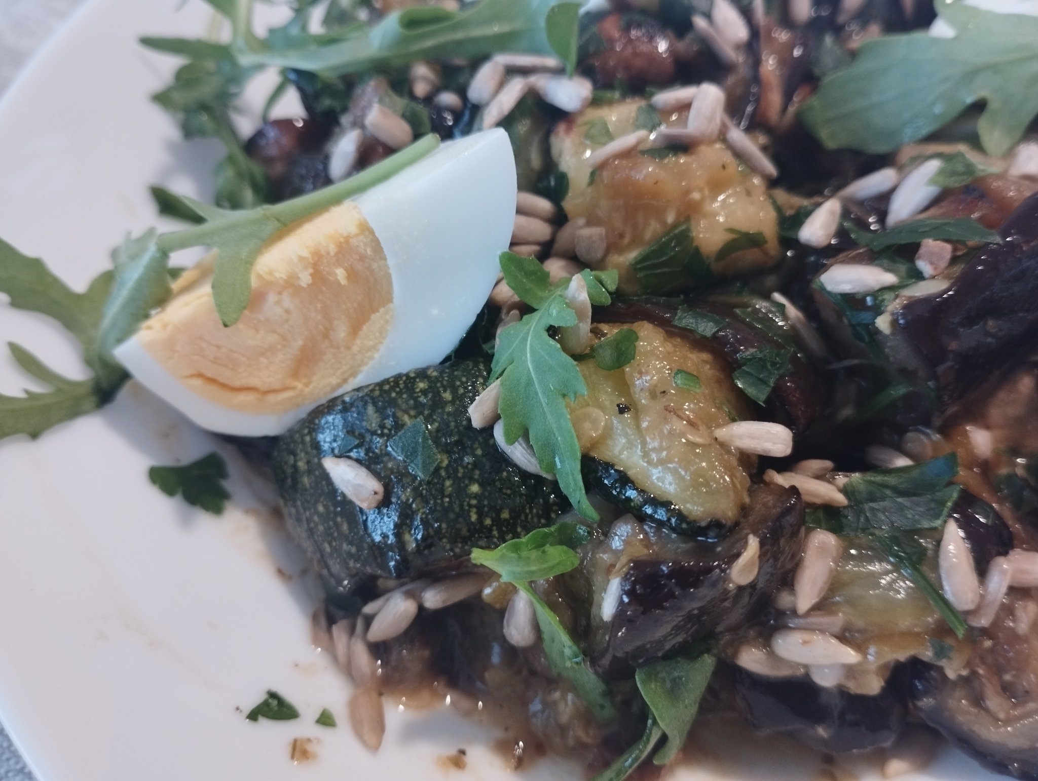 Топла салата от печени зеленчуци с медено-горчичена заливка в компанията на бяло винце!