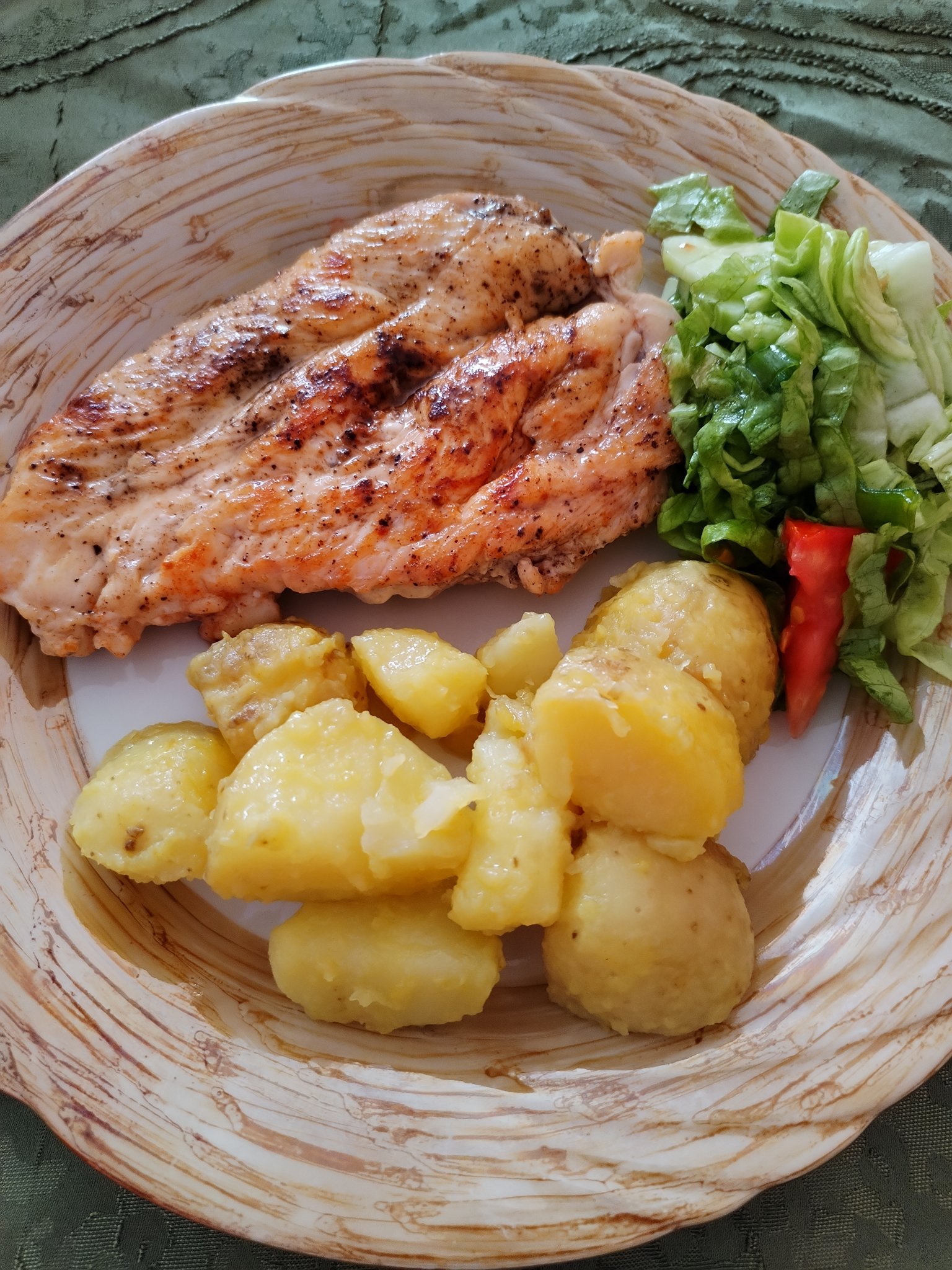 Пилешко филе със задушени картофи.Който забравя за какво е ходил до магазина яде картофите без копър.
