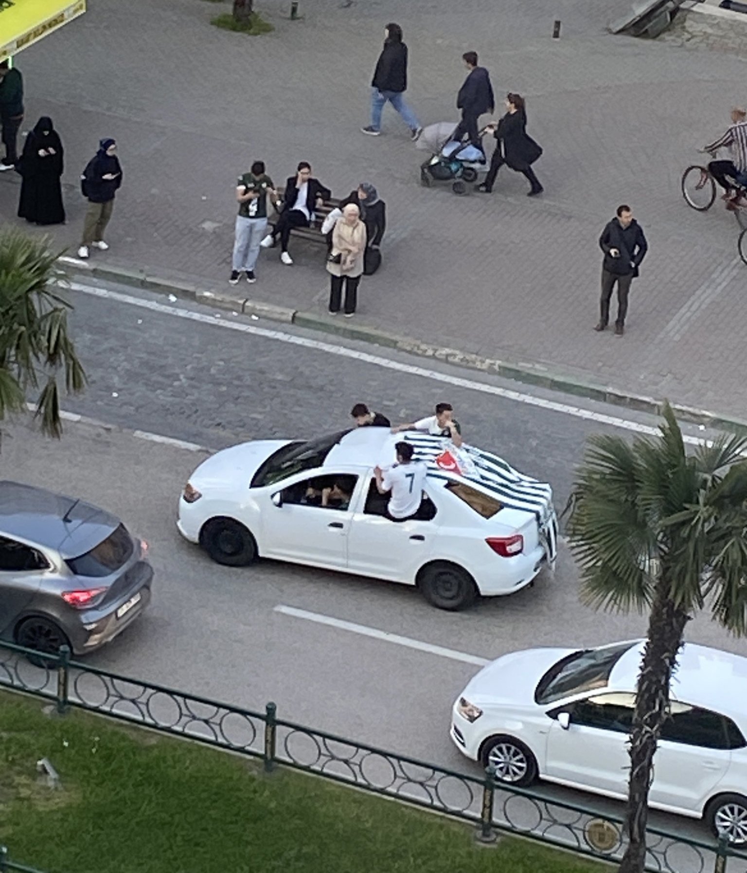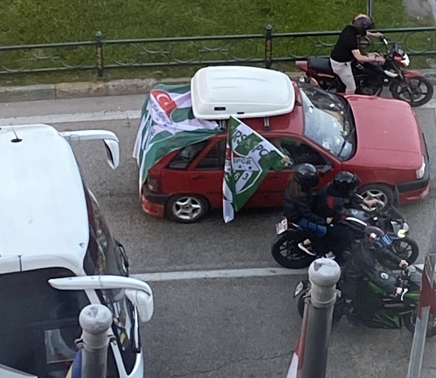 Преди малко се прибрах от разходка и от хотелската стая станах свидетел на радостното шоу на фенове на Бурсаспор, които днес победили. Коли, тромби, флагове…младежи облечени с фланелки бяло- зелено, коли с флагове- емблемата на футболния клуб. Радост и оживление.