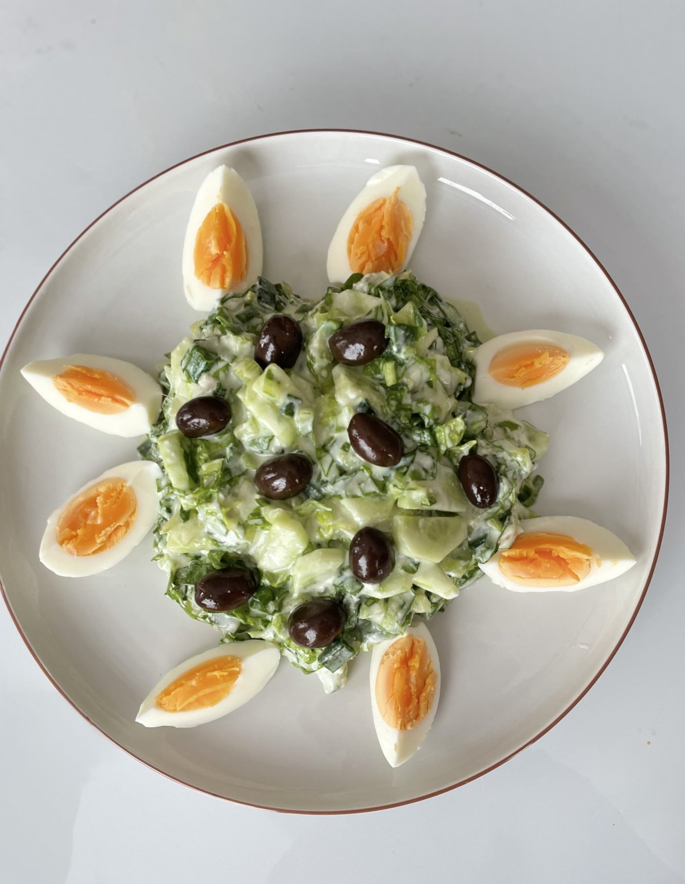 Нарязана на дребно маруля, 1 връзка зелен лук, краставици се разбъркват с половин кофичка кисело мляко и олио и сол на вкус.  Отгоре поставям маслинки. От страни на всяка порция нарязвам по 2 сварени яйца.