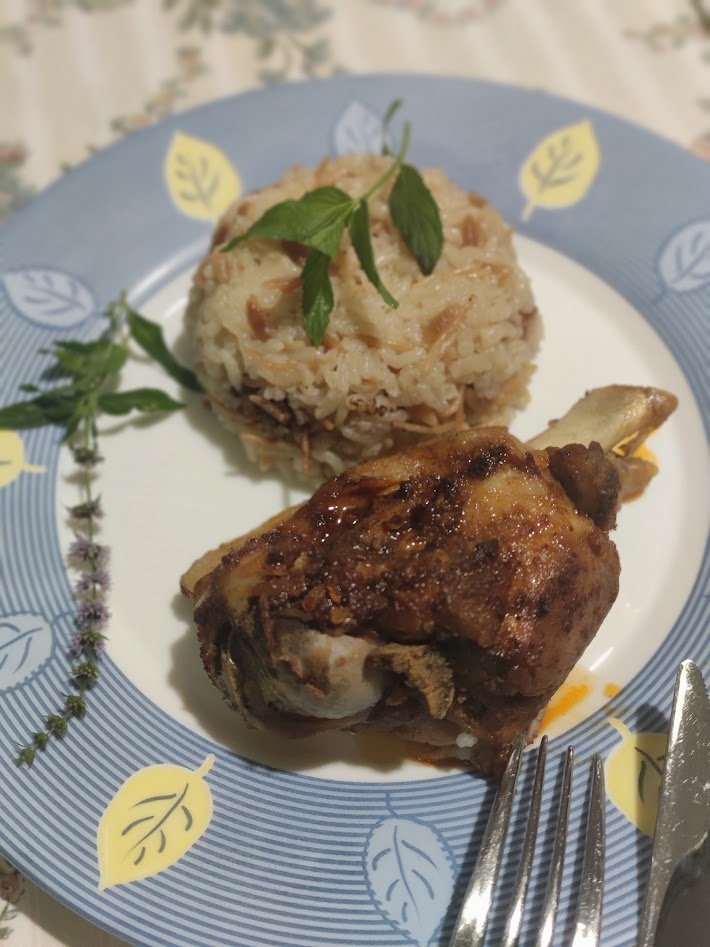 Пече се след това в тава на 200гр. около 30мин, като се намазва с масло и червен пипер; добавя се от бульона в който е вряло.