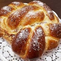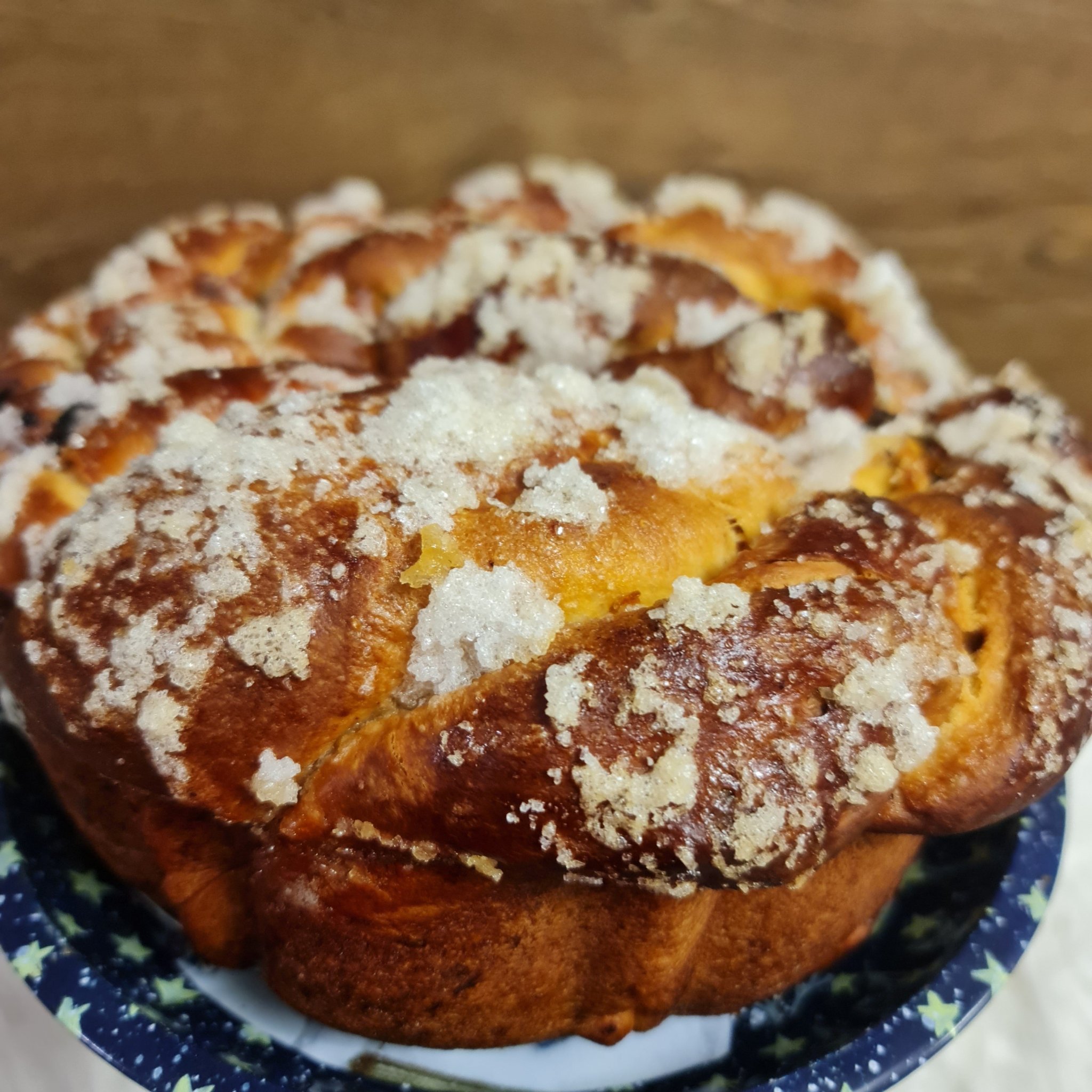 брашно - 1 кг, яйца - 4 бр., прясно мляко - 250 мл, олио - 200 мл, мая - 1 кубче от 40 г или 2 пакета от 7 г, захар - 16 с.л. (200 г), по 4 лъжици на яйце, лимонова кора - настърганата на 2 лимона, стафиди - 100 г накиснати в някакъв концентрат - ром, бренди,, коняк, водка, сол - 1/2 ч.л.