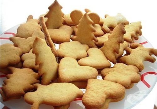 яйца - 2 бр., захар - 1 ч.ч., кисело мляко - 1/2 ч.ч., амонячна сода - 1 пакетче (10 г), сода бикарбонат - 1 ч.л., мас - 1/2 ч.ч. (мека), ванилия - 2 прахчета (по 2 г), брашно - 500 г, лимонова кора - от 1/2 лимон