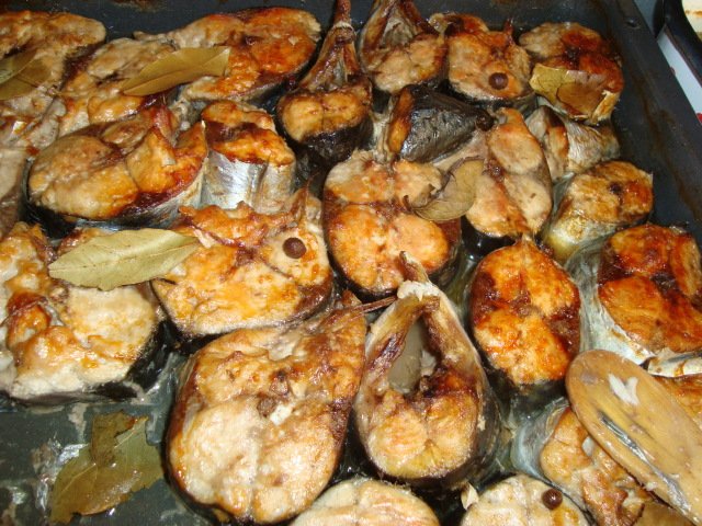 Рибата се почиства, измива хубаво и нарязва на парчета,като се отстраняват главите,перките и опашките. Нарежда се в тава. посолява се на вкус, се залива с една чаша оцет и 1 чаша олио (чаени), тук -там се слагат зърна бахар и дафинов лист. За малка тава- по половин чаша олио и оцет.
