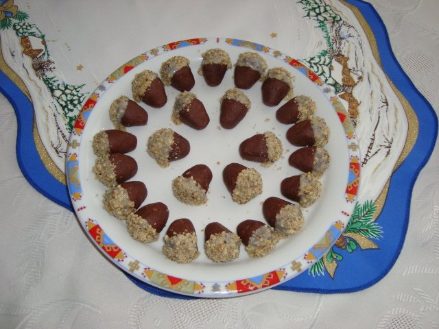 Смелете бисквитите в кафемелачка. Размийте маслото със захарта в дълбок съд. Добавете бисквитите, орехите, какаото, ванилията и рома(коняка).Разбъркайте добре.Разтопете шоколада. От сместа оформете жълъдчета и потопете единия им край в разтопения шоколад за да оформите шапчиците им. Дръжте жълъдчетата в хладилника два часа, за да се втвърдят.