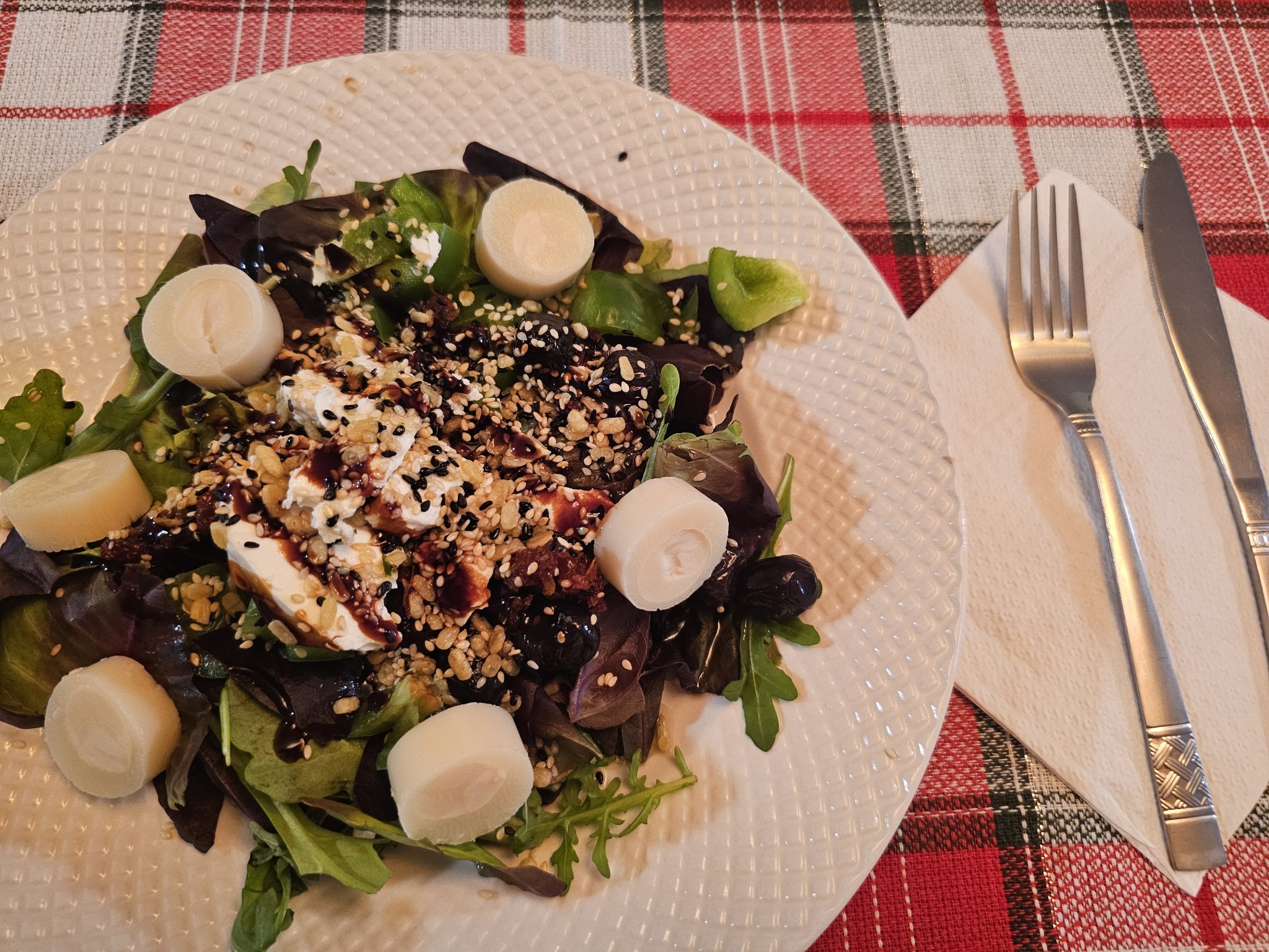 Микс зелении, зелена чушка, малко супен домат, козе сирене, hearts of palm, сусамова поръска, зехтин, балсамова редукция.