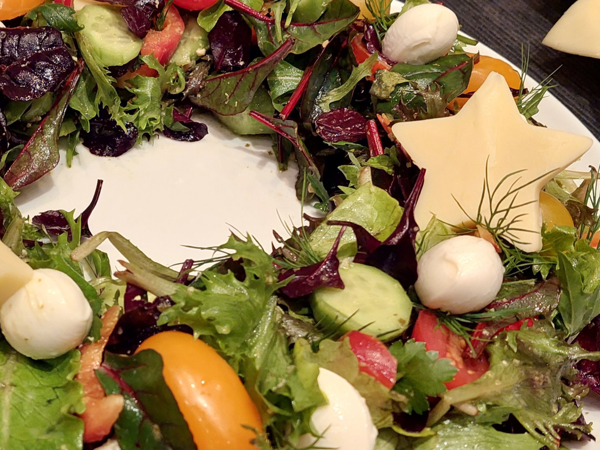 Салата от зелении микс, краставици, чушки, чери домати, мини моцарелки и кашкавалени звезди, оформена като Коледен венец