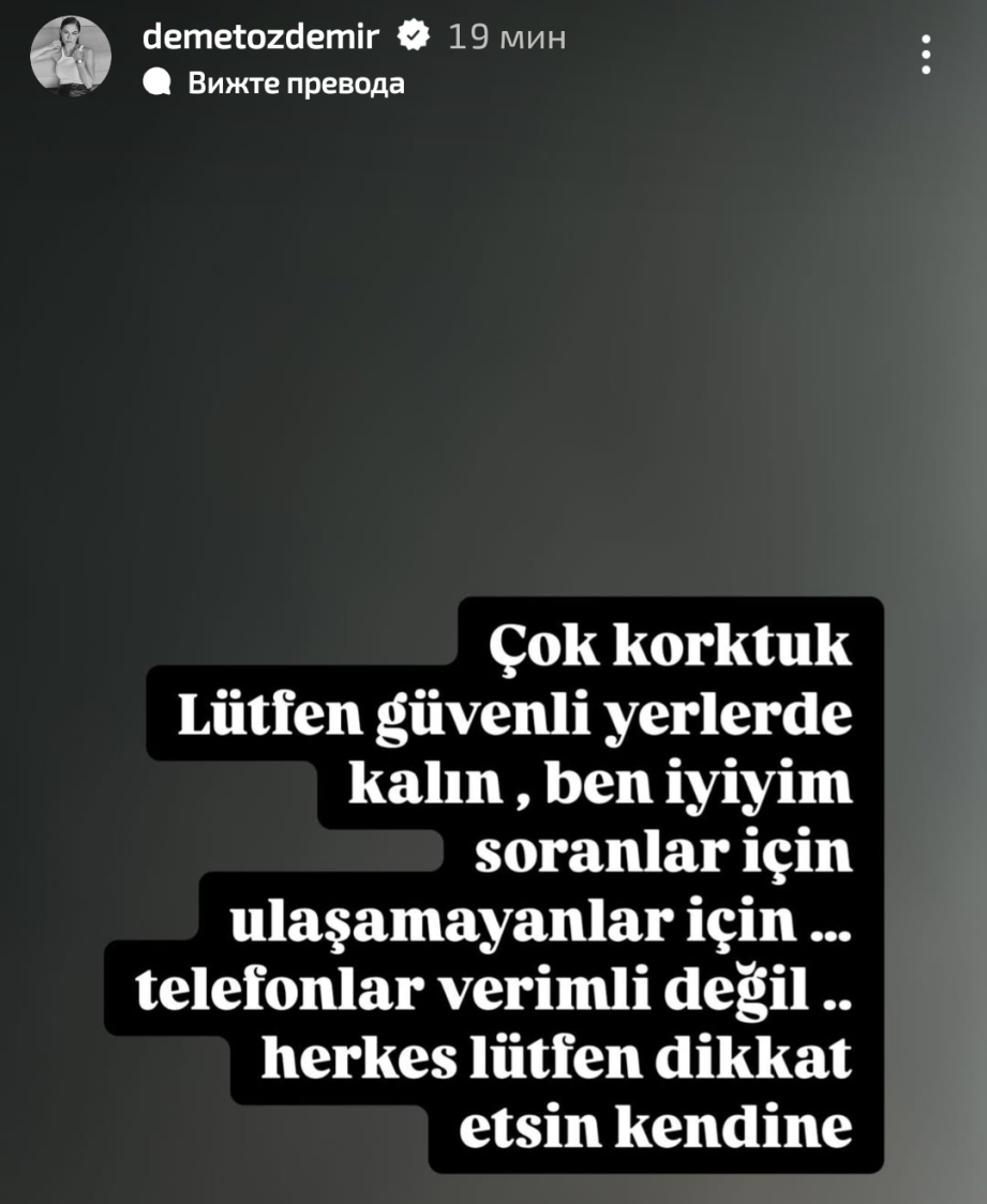 Демет пише, че много са се изплашили от земетресението. Моли хората да останат на сигурно място. На тези, които са се притеснили за нея отговаря, че е добре. На тези, които не са успели да се свържат с нея пише, че телефоните не работят най-добре. Моли всички да бъдат внимателни и да се грижат за себе си.