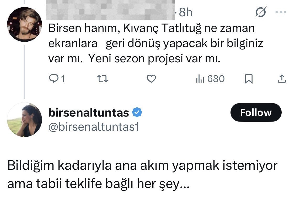 Вчера фен попита журналистката Birsen дали има информация кога #KıvançTatlıtuğ ще се завърне на екрана или дали той има нов проект през новия сезон?