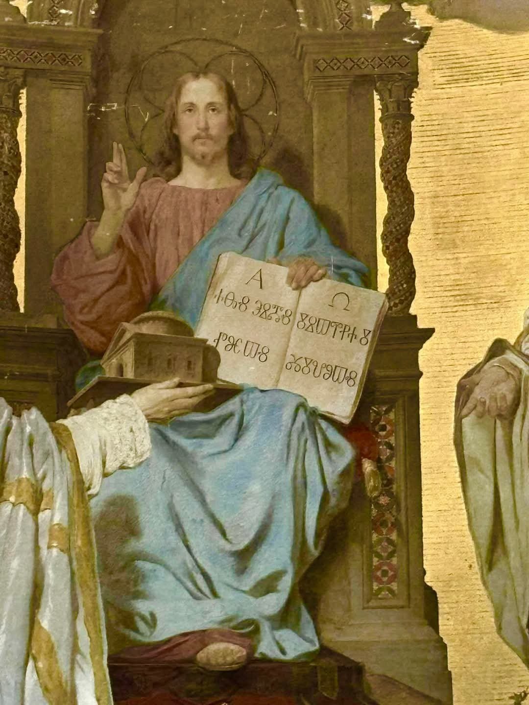 Икона на Исус Христос от базиликата "Сан Клементе" в Рим , единствената, на която Христос държи книга с надпис на глаголицата.
