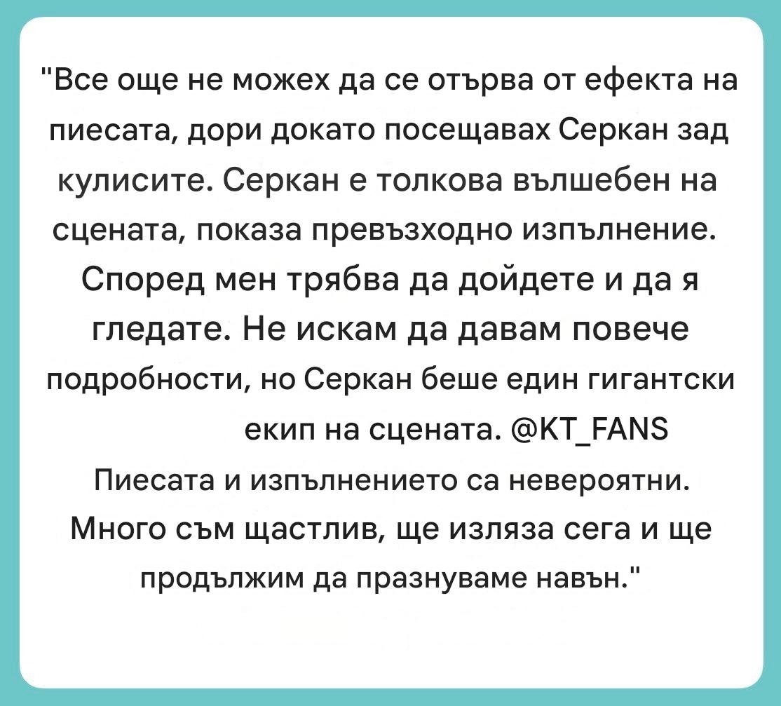 Благодаря ви на теб и Айрето Heart Eyes за превода, явно наистина много харесва играта на приятеля си Серкан и самото представление, разбрах, че сам играе няколко роли, а Киво казва, че е великолепен на сцената..