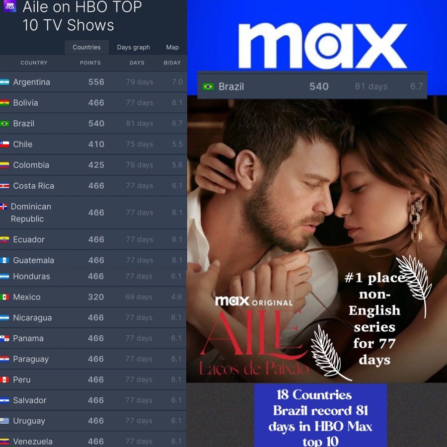 Огромен и безпрецедентен успех на сериала Aile на HBO Max, особено в Бразилия 🇧🇷, където беше в топ 10 на HBO Max в Бразилия 🇧🇷 за 81 дни.