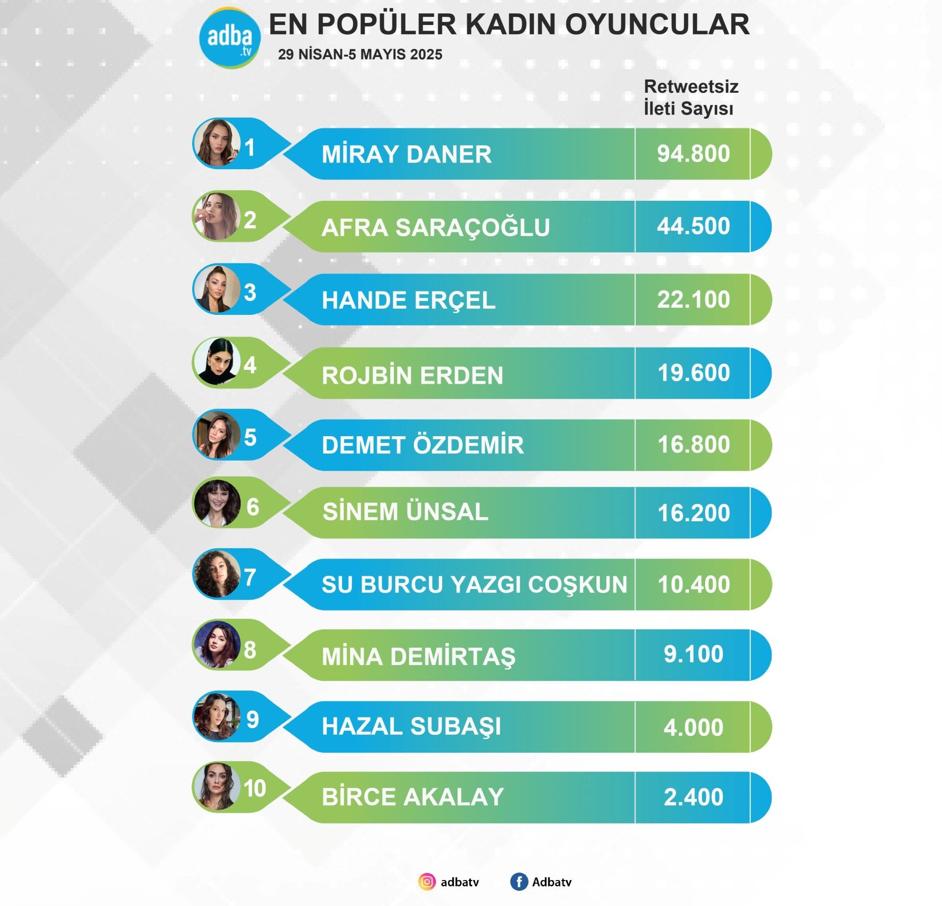 "Адба обяви кои са най-популярните актриси в социалните мрежи за периода 29 април - 5 май. Ханде тази седмица заема 3-та позиция Simple Smile