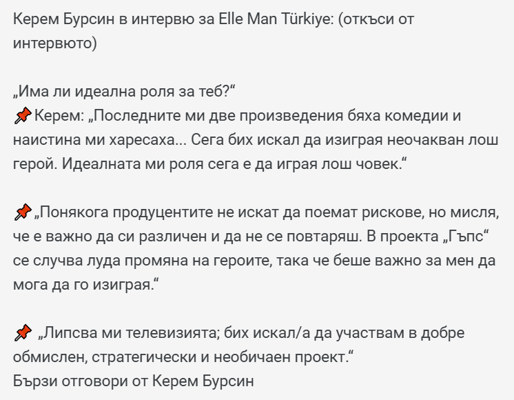 Постоянното играене на едни и същи роли започва да омръзва на всички в един момент. Важното е как разказвам историята и как поставям тези герои в сюжета. Публиката не се влюбва в теб, тя се влюбва в този герой. Успях да се вживея в ролята на силен персонаж, който писателят създаде в своя свят. Надявам се, че в бъдещи проекти други писатели и актьори ще имат възможност да се възползват от тази възможност. В турските телевизионни сериали е невъзможно да се предвиди точно какво ще се превърне в международен хит, но винаги знаеш, че има потенциал.