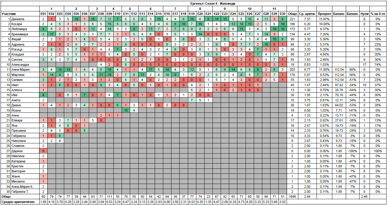 Аз явно съм пО балък и от Мартин, защото все я пропускам тая прословута злоба и повечето момичета са ми симпатични (особено като си припомня някои плашила от предни години). Като набуташ 10+ жени в една къща, това става - разделят се на групички, има някакви търкания. Аз се радвам на приятелствата, които са създали, и ги разбирам защо са се разкиснали и гледат лошо щастливите влюбени.