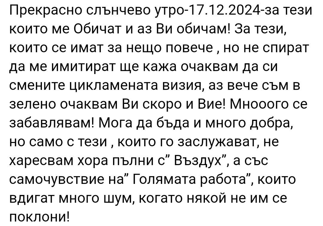 За протокола понеже някой по назад попита, аз съм под 30, а жената написала ми съобщението е 78набор. Днес се е кротнала и не ми е звъняла. Разгледах и публикациите във фейс /чудеса прави телефонния номер/ хем си наясно че си втори коридор, хем наперен е положението.. Преценете сами 😀 грам не е на център, както се опасявах, може би от критическата или от доказване на жена му 🤔