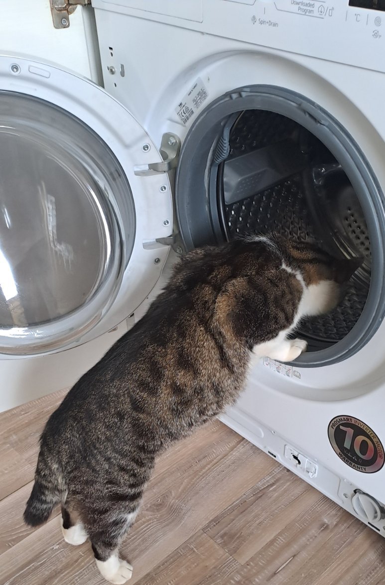 Да ви покажа един любопитко. Изследва всичко непознато и сега за първи път видя широко отворена вратата на пералнята. Беше напът да влезе вътре, но аз като станах да го снимам и се уплаши, че ще му се скарам.