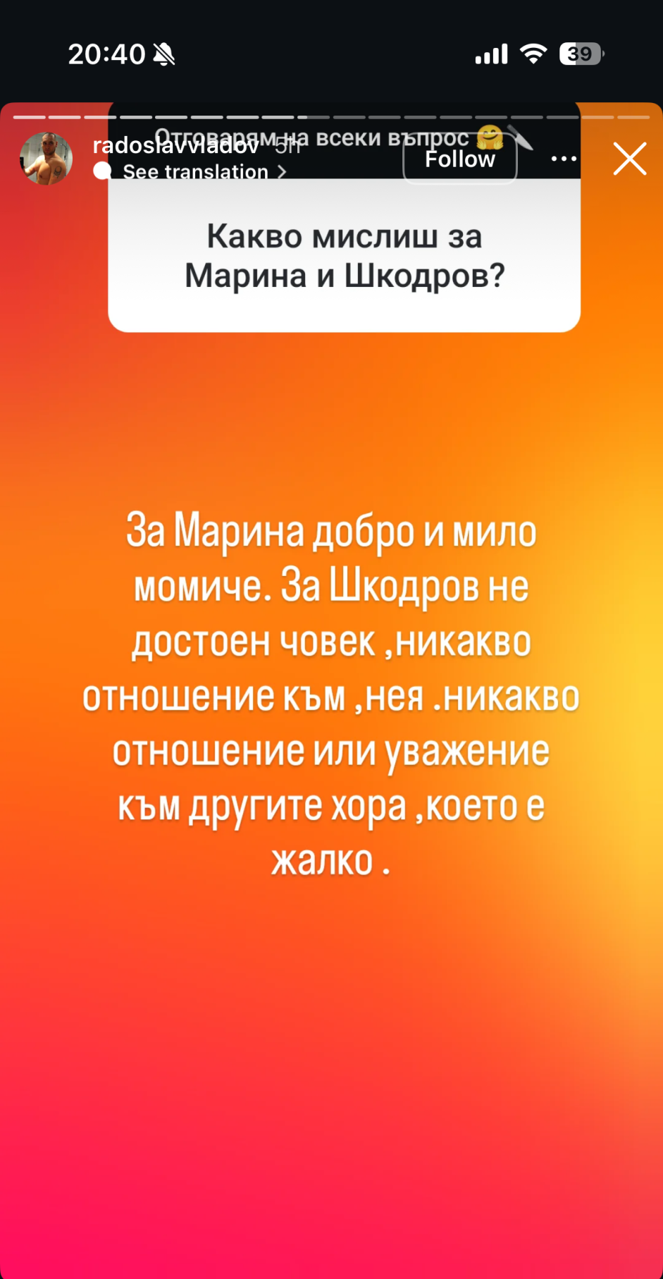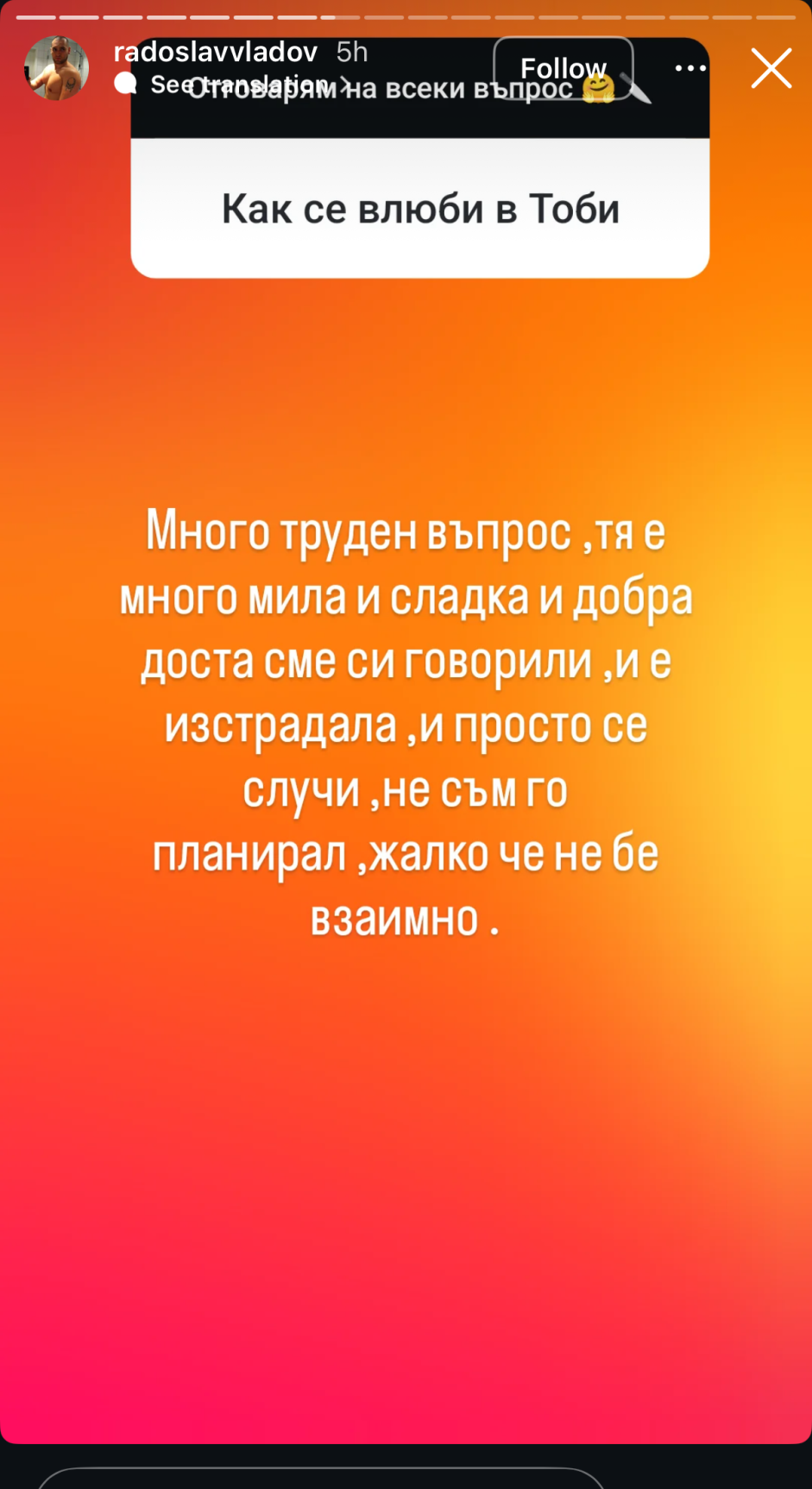 Владов онзи ден си беше качил на стори, че не само, че няма никакви отношения ами дори и приятелски такива нямат, защото тя се държала пренебрежително и надменно. Нещп такова, по спомен цитирам, жалко, че не направих скриншот