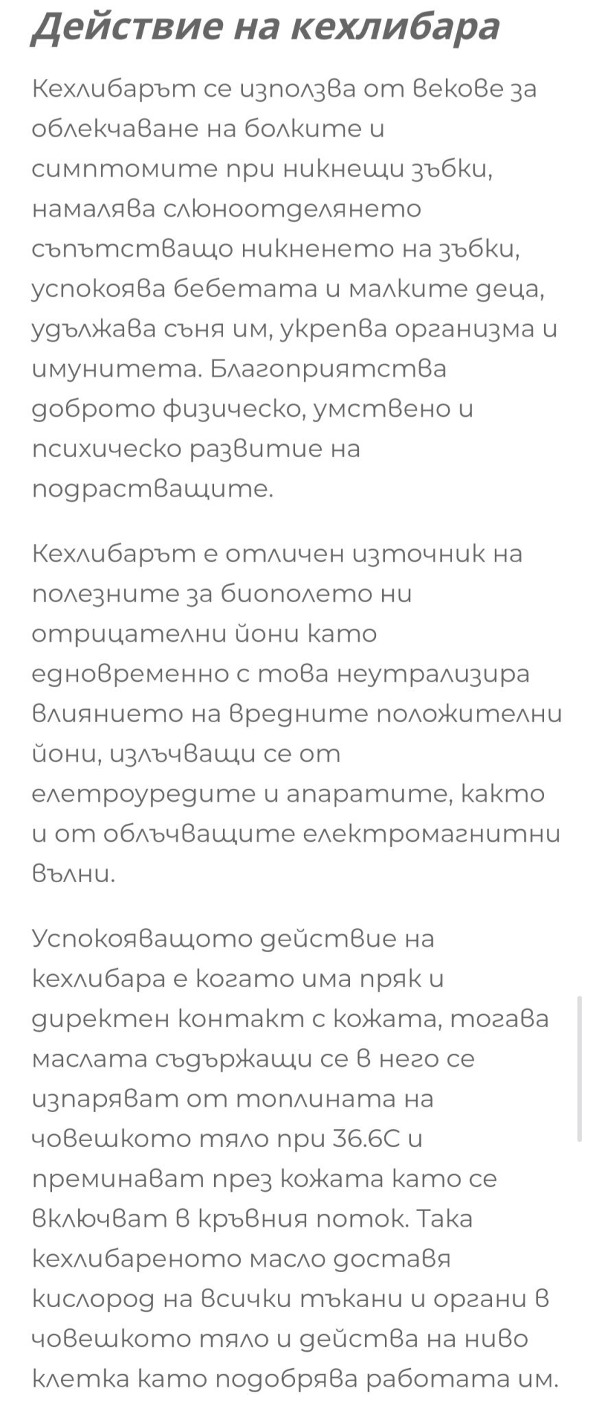 Между другото, майка ми има огърлица от кехлибар. Когато е била млада, се е наложило да я оперират "от гуша" - житовидна жлеза. Някой й е казал да я носи и смятам, че е било от помощ. Още дори не съм била родена.