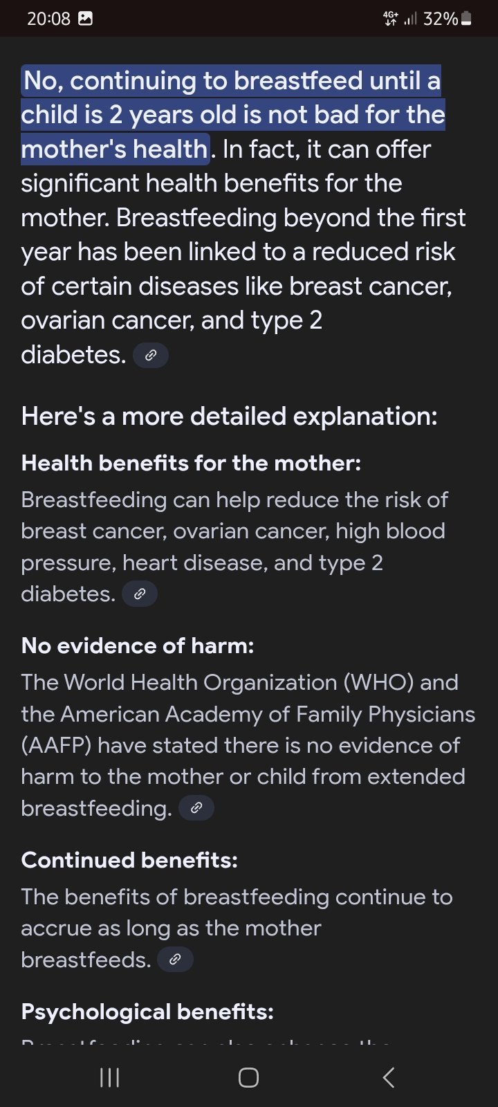 Не съм веща по темата, но ми изникна в главата - може ли най-оптималното за бебето (2г кърмене) да не е най-доброто за тялото на майката? Мамолога си гледа неговото - жената в случая.