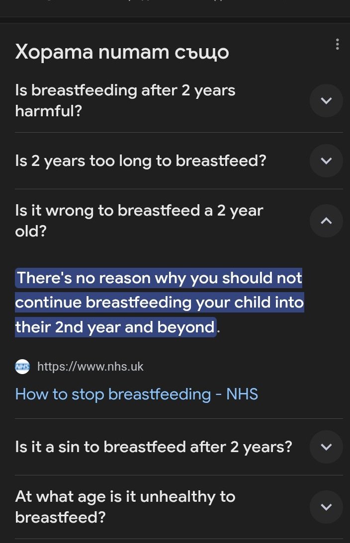 Лина, подкрепям въпросът, мнението и критичното ти мислене. Последното го и уважавам. Защото не може цял живот "някой" да ни казва какво и как е правилно. То е и до усет, да усещане, не на последно място и до възможност. Освен това, харесвам Ася Демирева, но не може бебето да определи до кога ще суче, защото, ето как изглежда това: