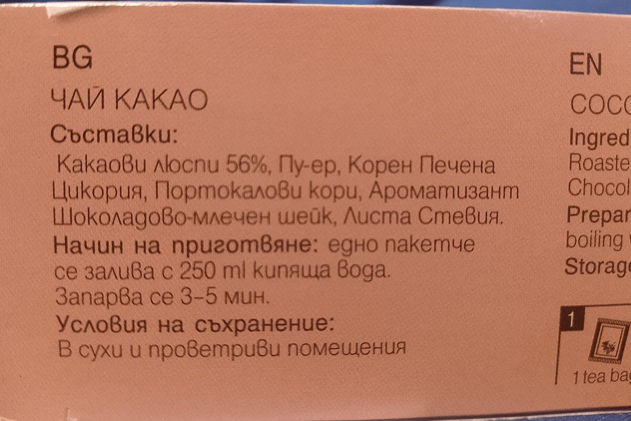 Има чай с какао в ДМ, ето го - https://www.dm-drogeriemarkt.bg/dmbio-bilkov-chay-s-s-kakao-20x2 … 066447518474.html