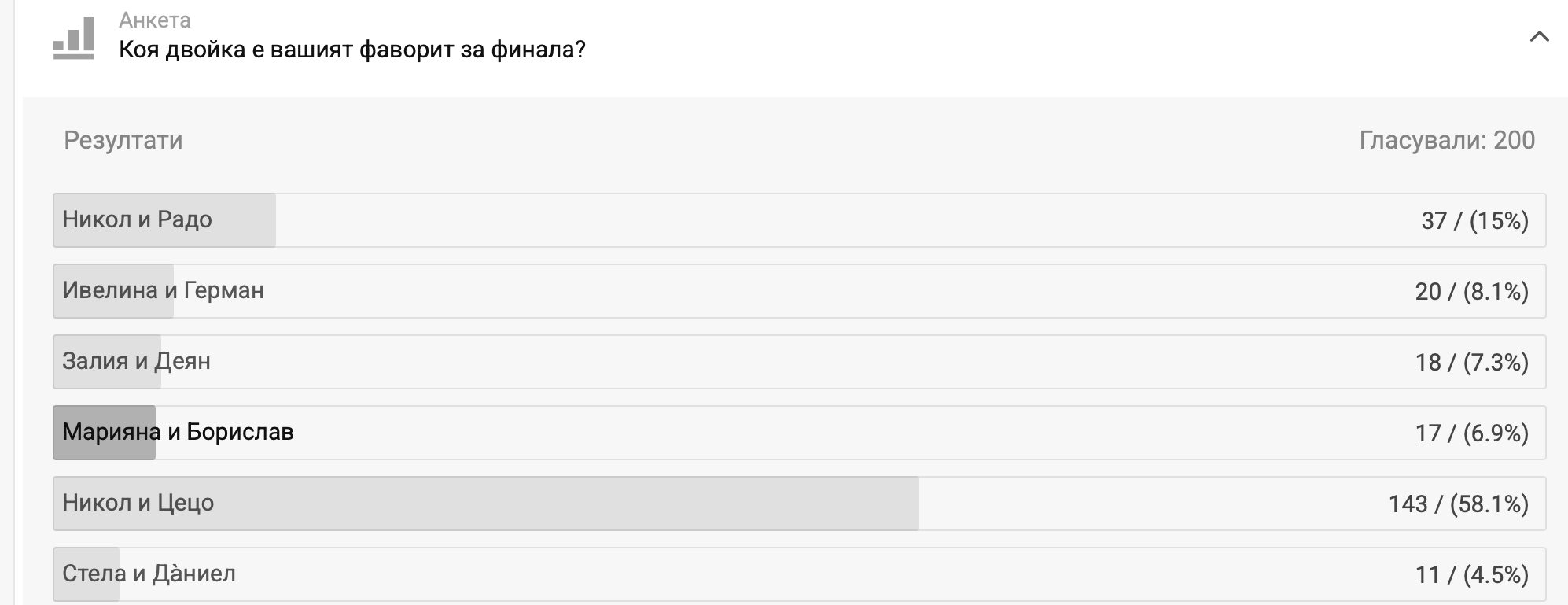 Аз ви казах какво ще стане. Ако на финала са Ники и Цецо печелят те. Ако ги няма, печелят Ивето и Герман. Така че реално финала за Ники и Цецо беше на полуфинала срещу трагичните Залия и Дидо.