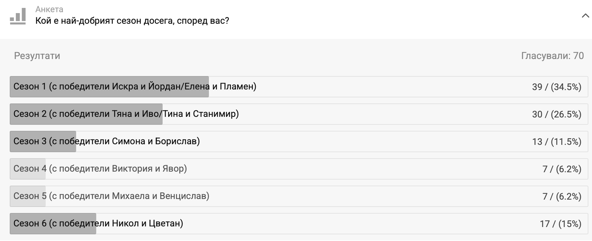 Най-харесваният сезон, според гласувалите е първият сезон с 34.5%.