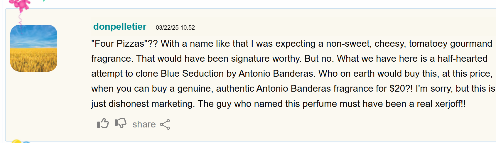 Присъединявам се към мнението на Дези за Quattro Pizzi - съвършено блендиран парфюм, истинско удоволствие. Твърдо ми е в списъка за покупки, въпрос на време и добра оферта е. Не го припознавам като летен парфюм - не че не може през лятото, но определено не ми е водещото при него. По-тежкарско, уютно-съблазнително, опиянено ми действа. С глас съм се смяла на едно възмутено ревю във Фрагрантика, споделям го с вас за добро настроение: