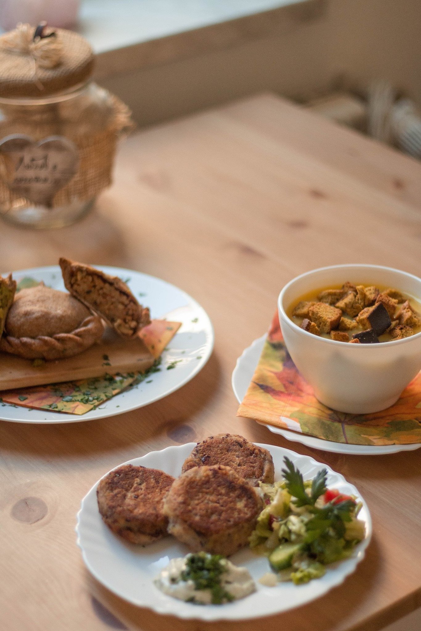 Малко вдъхновение от мен. Зеленчукова крем супа, кюфтета от боб със салата и веган майонеза,  самоси с плънка от картофи, грах и карфиол.