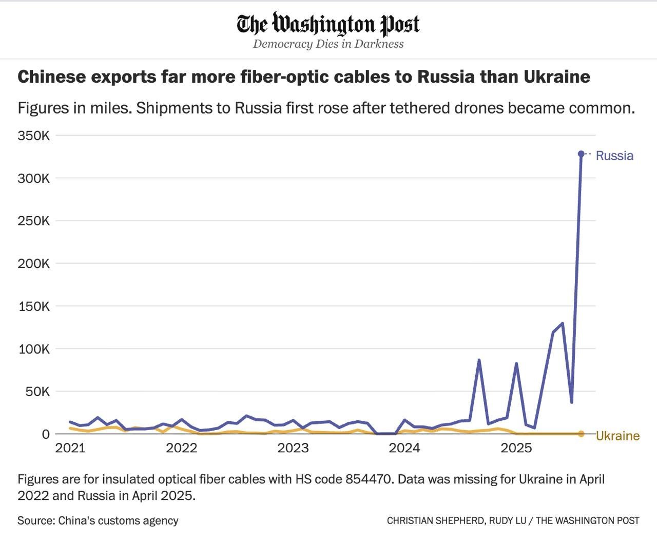 WP със статия, че Китай е увеличил рязко експорта към Русия на компоненти за оптичните дронове.